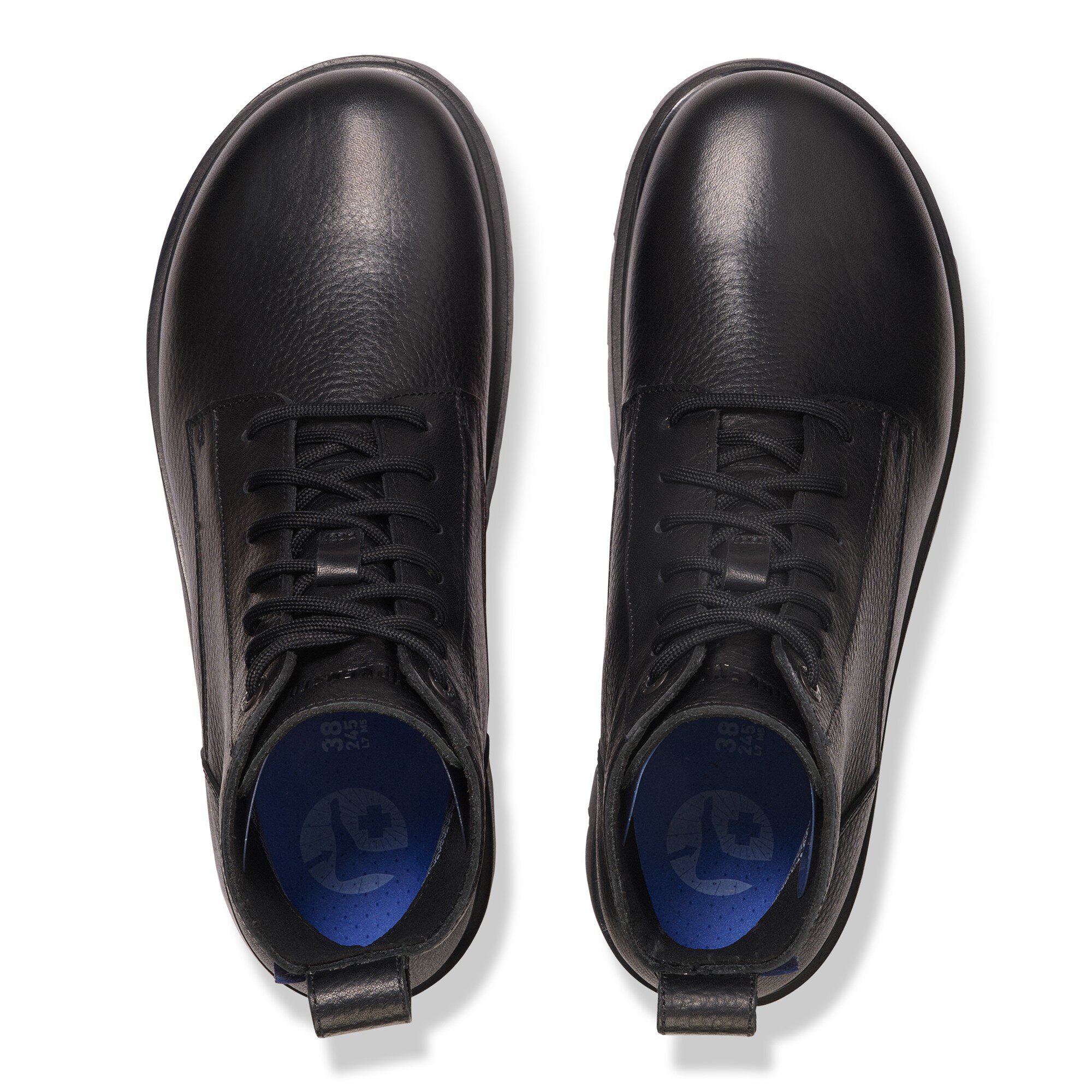 Mit dem Highwood präsentiert BIRKENSTOCK einen schlichten, halbhohen Chelsea Boot, den man dank Korkelement in der Sohle sofort als echtes BIRKENSTOCK Original erkennt. Durch seine Schnürung bietet er optimalen Halt und Anpassbarkeit. Das bequeme und leichte Deep Blue Footbed macht den Schuh zu einem komfortablen 24/7 Begleiter insbesondere an langen und aktiven Tagen. Perfekt für die nächste Reise, ausgiebige Spaziergänge und Städtetrips. Diese Variante überzeugt mit einer hochwertigen Gummiaußensohle, die durch eine professionell inspirierte Stollenstruktur hervorragende Bodenhaftung bietet. Biomechanisch platzierte Profilelemente fördern einen natürlichen Bewegungsablauf und sorgen für maximalen Laufkomfort. Das Obermaterial besteht aus weichem, genarbtem Naturleder. Dank der integrierten Membran-Technologie bietet das Produkt zuverlässigen Schutz vor Nässe.