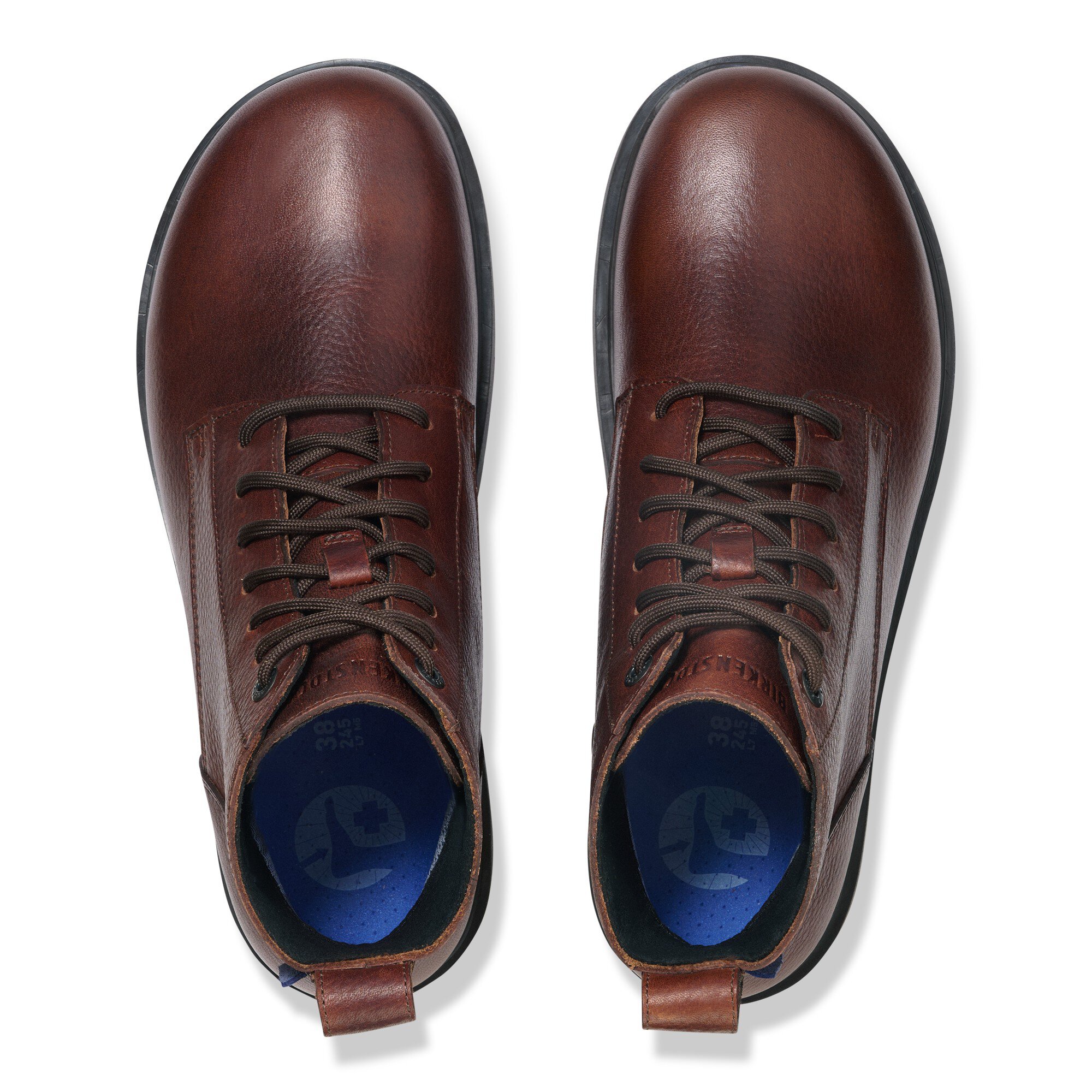 Mit dem Highwood präsentiert BIRKENSTOCK einen schlichten, halbhohen Chelsea Boot, den man dank Korkelement in der Sohle sofort als echtes BIRKENSTOCK Original erkennt. Durch seine Schnürung bietet er optimalen Halt und Anpassbarkeit. Das bequeme und leichte Deep Blue Footbed macht den Schuh zu einem komfortablen 24/7 Begleiter insbesondere an langen und aktiven Tagen. Perfekt für die nächste Reise, ausgiebige Spaziergänge und Städtetrips. Diese Variante überzeugt mit einer hochwertigen Gummiaußensohle, die durch eine professionell inspirierte Stollenstruktur hervorragende Bodenhaftung bietet. Biomechanisch platzierte Profilelemente fördern einen natürlichen Bewegungsablauf und sorgen für maximalen Laufkomfort. Das Obermaterial besteht aus weichem, genarbtem Naturleder. Dank der integrierten Membran-Technologie bietet das Produkt zuverlässigen Schutz vor Nässe.