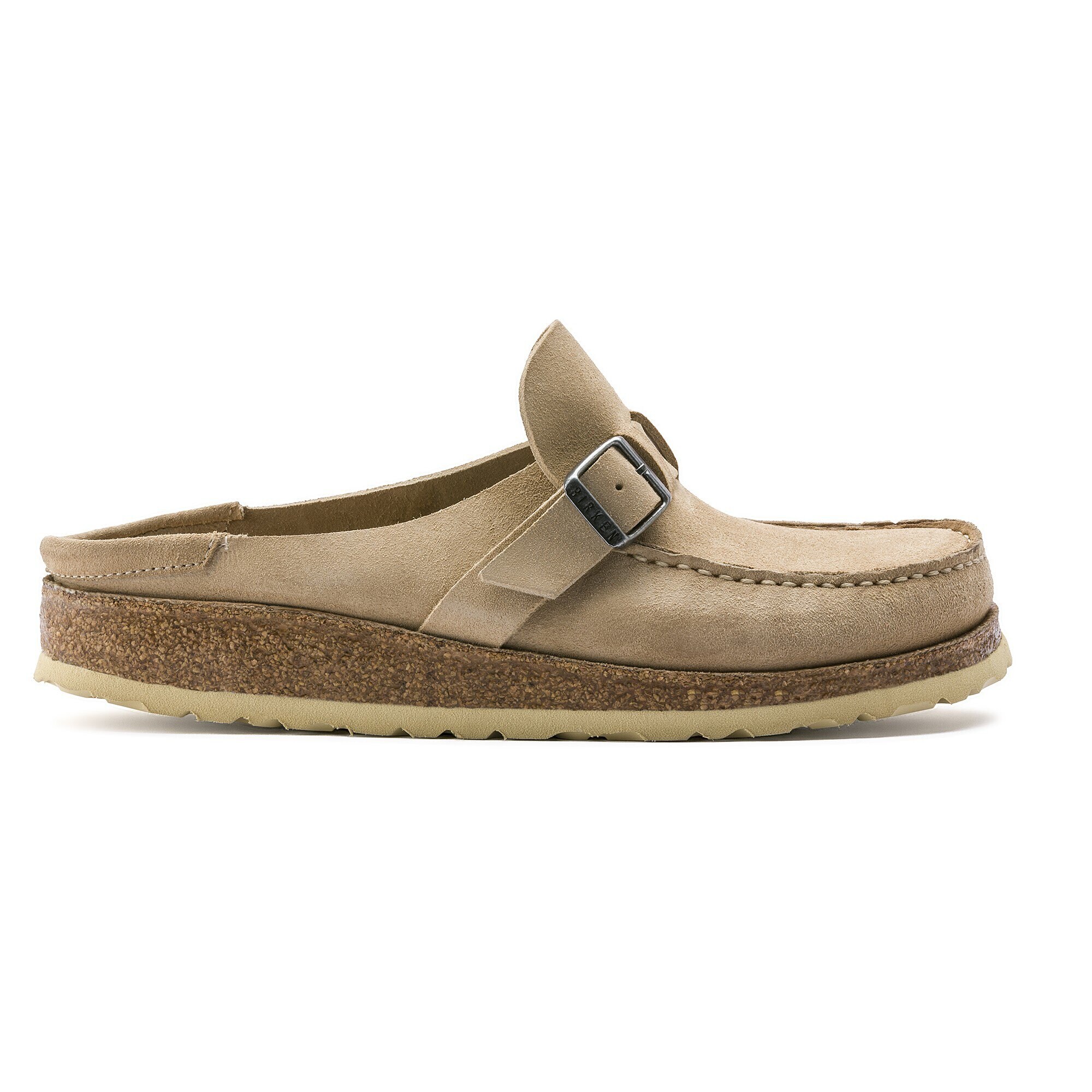 Sabot de type mocassin unique à attache fixe et à assise plantaire moulée, le modèle Buckley est immédiatement reconnaissable comme un authentique modèle BIRKENSTOCK. Présenté en cuir velours.