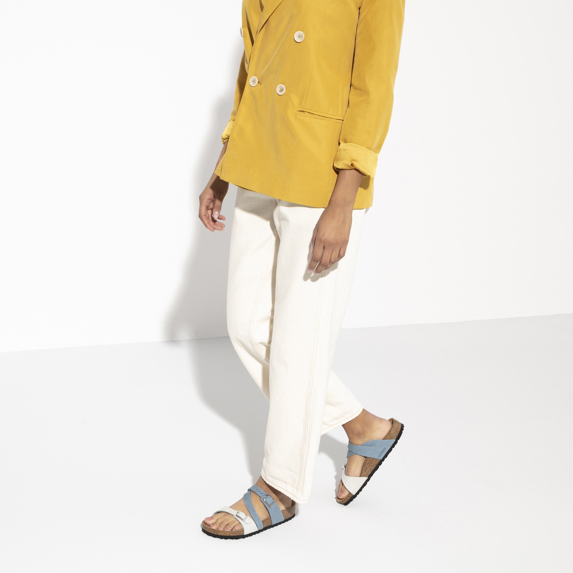 Le modèle Salina de la sandale est unique avec ses brides de pied positionnées de façon non conventionnelle et ses brides entrecroisées. Un design féminin associé à l’assise plantaire emblématique de BIRKENSTOCK qui offre à la fois confort et style. Présenté dans les tons de couleur assortie en cuir nubuck avec boucles brillantes en forme de D.