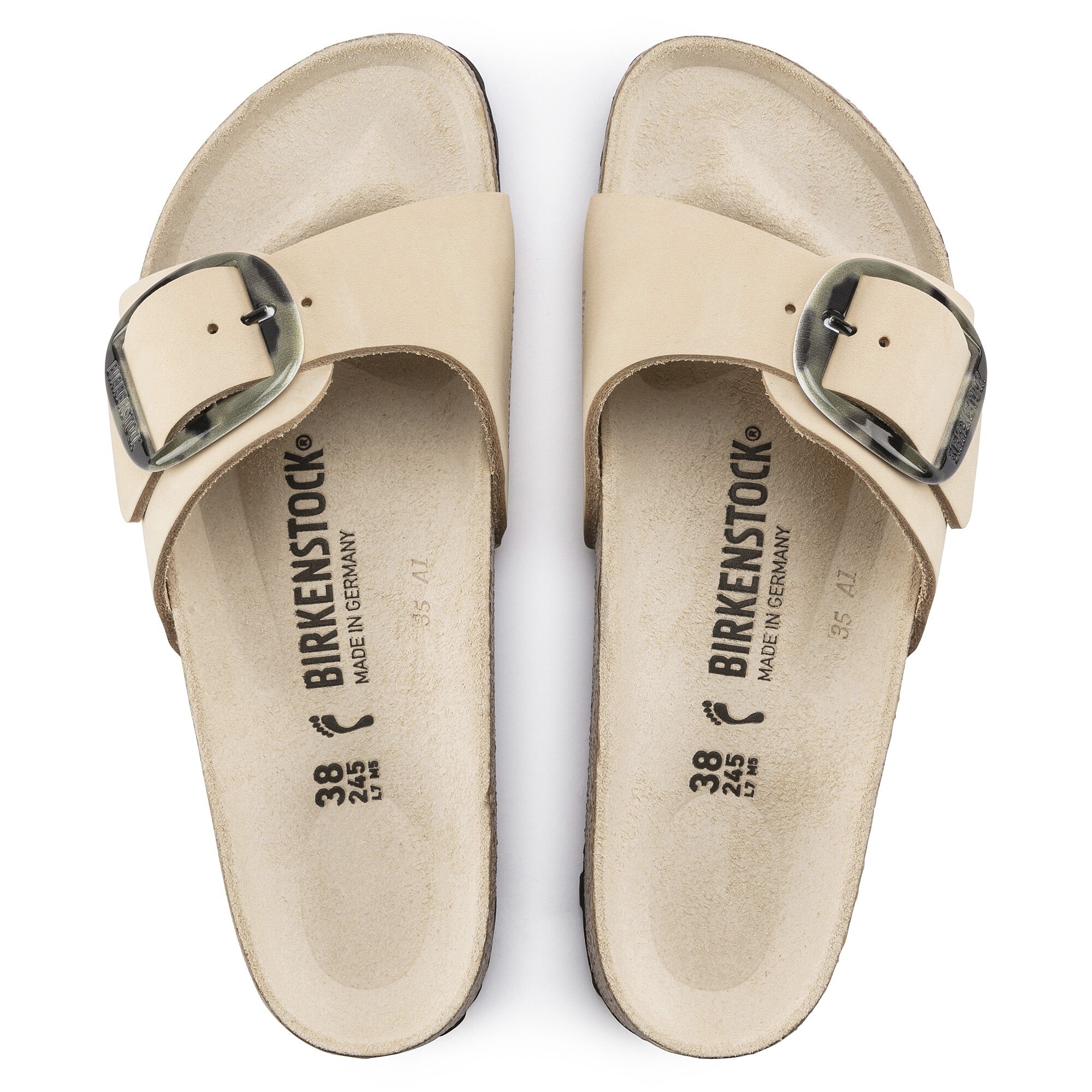 A strap, a buckle and a contoured cork footbed are masterfully combined to create the original Birkenstock sandal - the Madrid. An iconic slide with a new camo-inspired amplified buckle accent. Shown in nubuck leather.