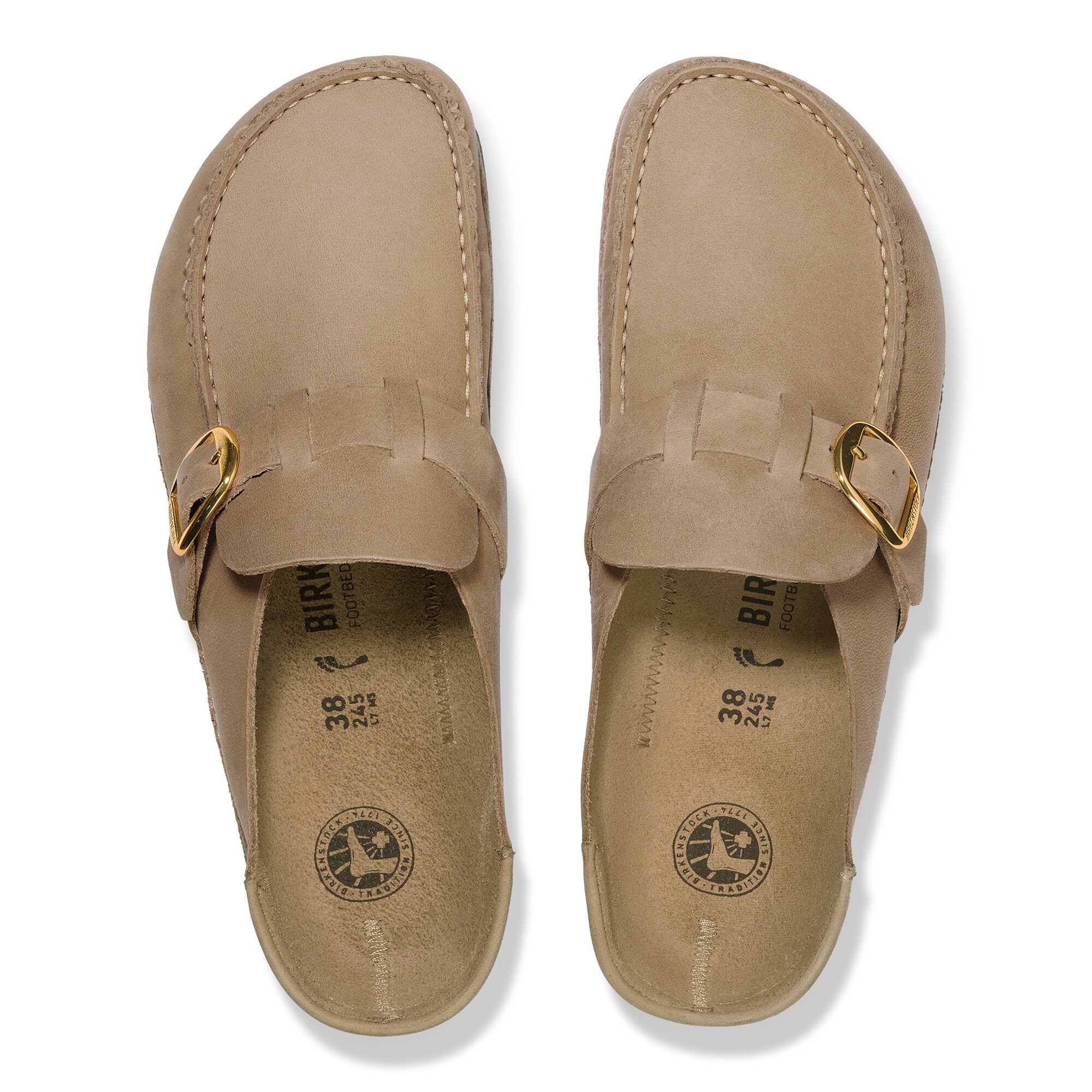 Der BIRKENSTOCK Buckley ist ein halboffener Clog im Mokassin-Stil, den man durch seine breite Korksohle sofort als echtes BIRKENSTOCK Original erkennt. Ein Hingucker ist die auffällige Naht. Diese Variante zeigt sich mit unserer beliebten Big Buckle. Das Obermaterial besteht aus besonders dickem, geöltem Nubukleder, das offenkantig verarbeitet wurde.