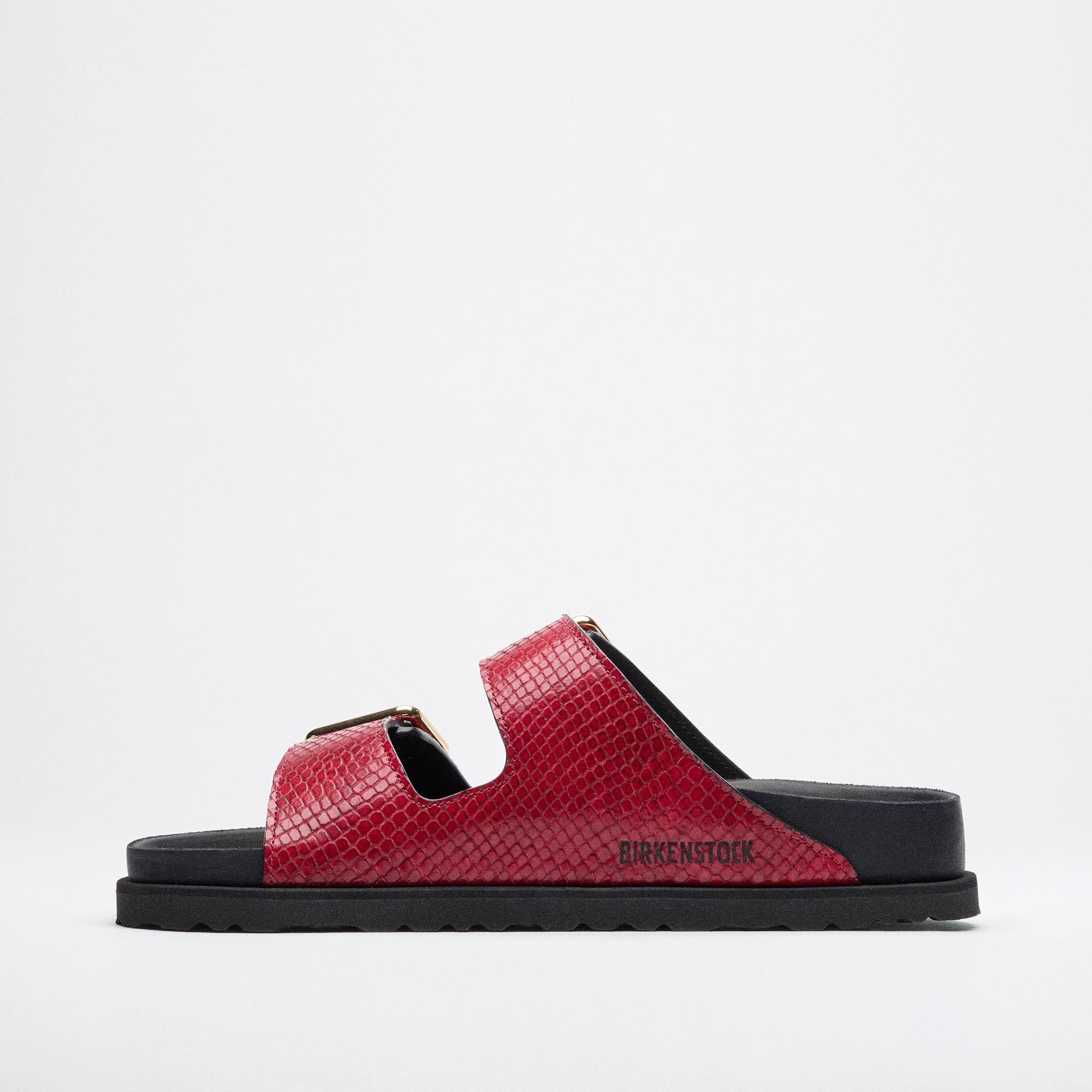 Der Arizona wird mit einem Obermaterial aus luxuriösem italienischen Leder mit Python-Prägung neu aufgelegt und ist vollständig mit weichem Nappaleder überzogen. Die Farben der Kollektion setzen das markante Schlangenmuster in Beige und Rot gekonnt in Szene. Das legendäre anatomisch geformte Fußbett von BIRKENSTOCK ist mit schwarzem Leder bezogen und jedes Paar verfügt über die unverwechselbaren Schnallen von 1774 in Gold oder Silber.