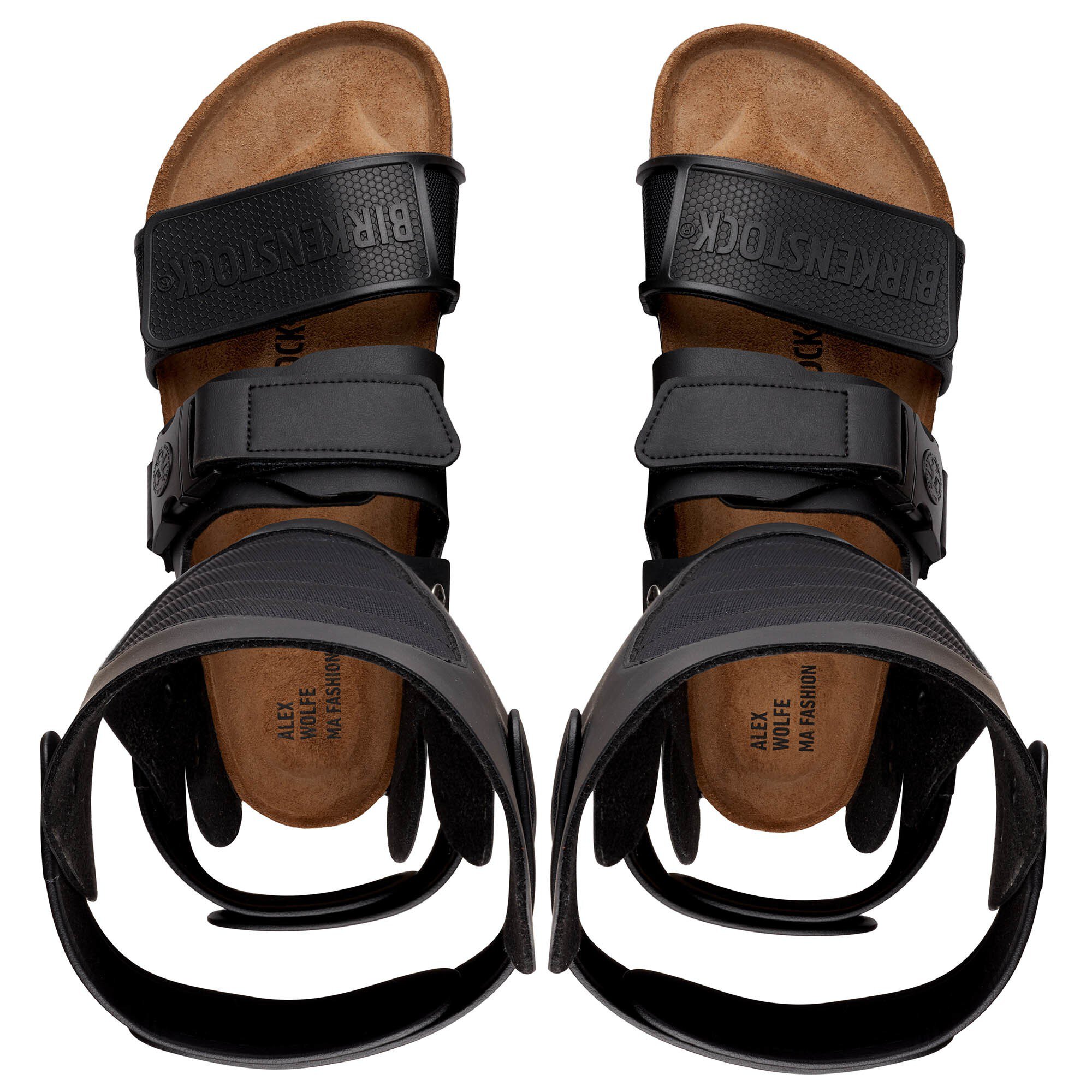 Wolfe macht sich BIRKENSTOCKs Expertise im Bereich des orthopädischen Schuhdesigns zu Nutze und seine Version der Rotterdam-Moto-Sandale sticht mit urbanem Print und auffälliger Unterschenkel-Konstruktion hervor. Mit dem eigens durch BIRKENSTOCK geschaffenen Material Birko-Flor kreiert er ein flexibles Schild, zu dem die Decksohle aus Nappaleder und Veloursleder einen weichen und beruhigenden Kontrast bildet.