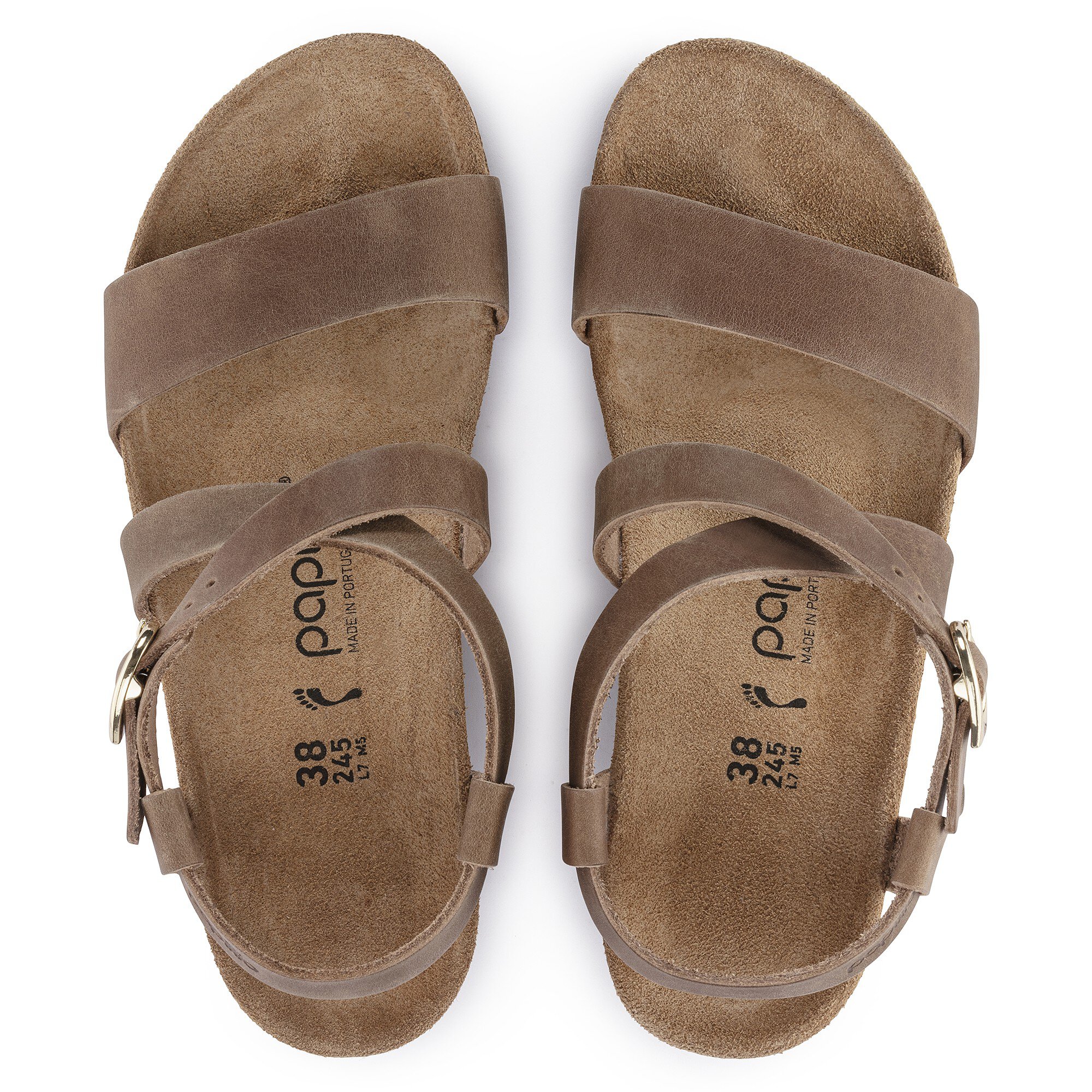Remsandalen Sibyl fra Papillio er en kilesandalet, der imponerer med sit flydende og gracile look. Det opnås med de smalle remme, der feminint omslutter foden. De cirkelrunde, fine spænder skaber et særligt blikfang. Overmaterialet består af særlig tyk, olieret nubucklæder, der er bearbejdet med åbne kanter.