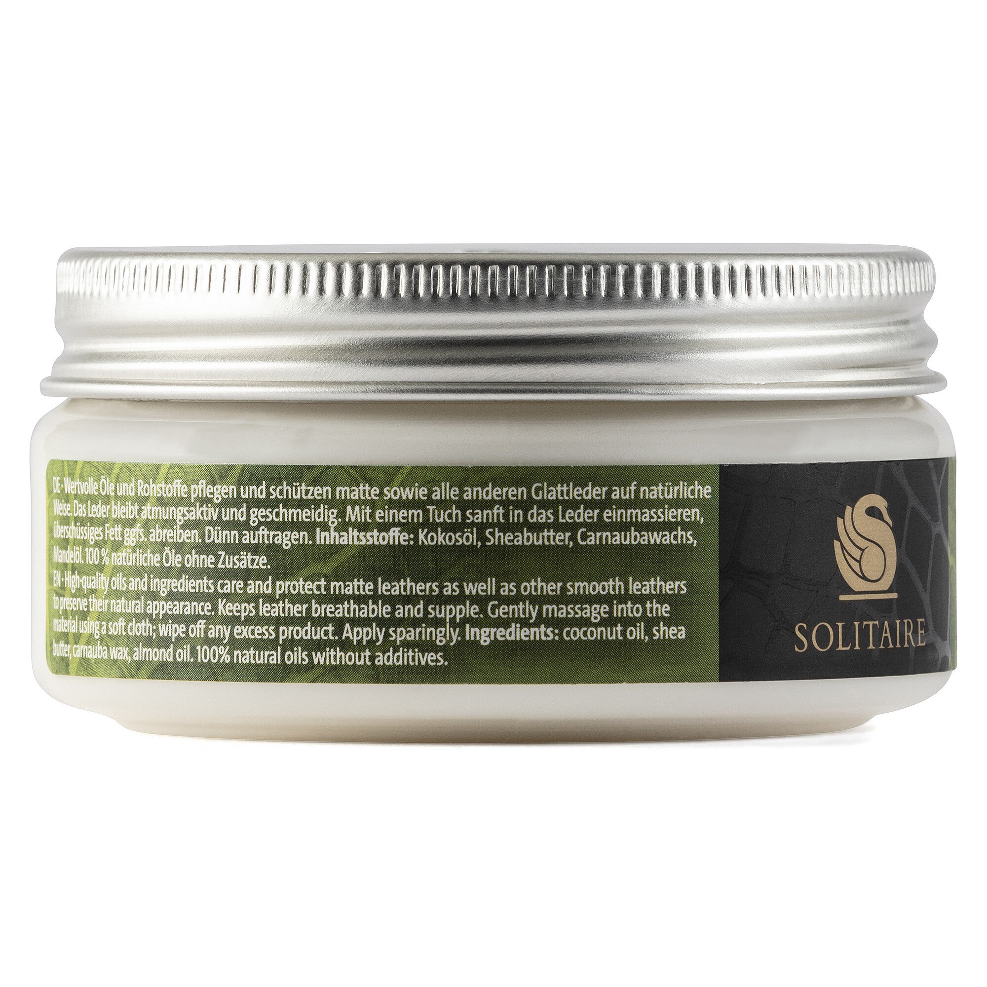 The “Balm Naturelle” of our partner Solitaire is particularly suitable for caring for and impregnating natural and matte leathers, such as our popular oiled nubuck leather. It nourishes the leather intensely and helps maintain the matte, waxed look.