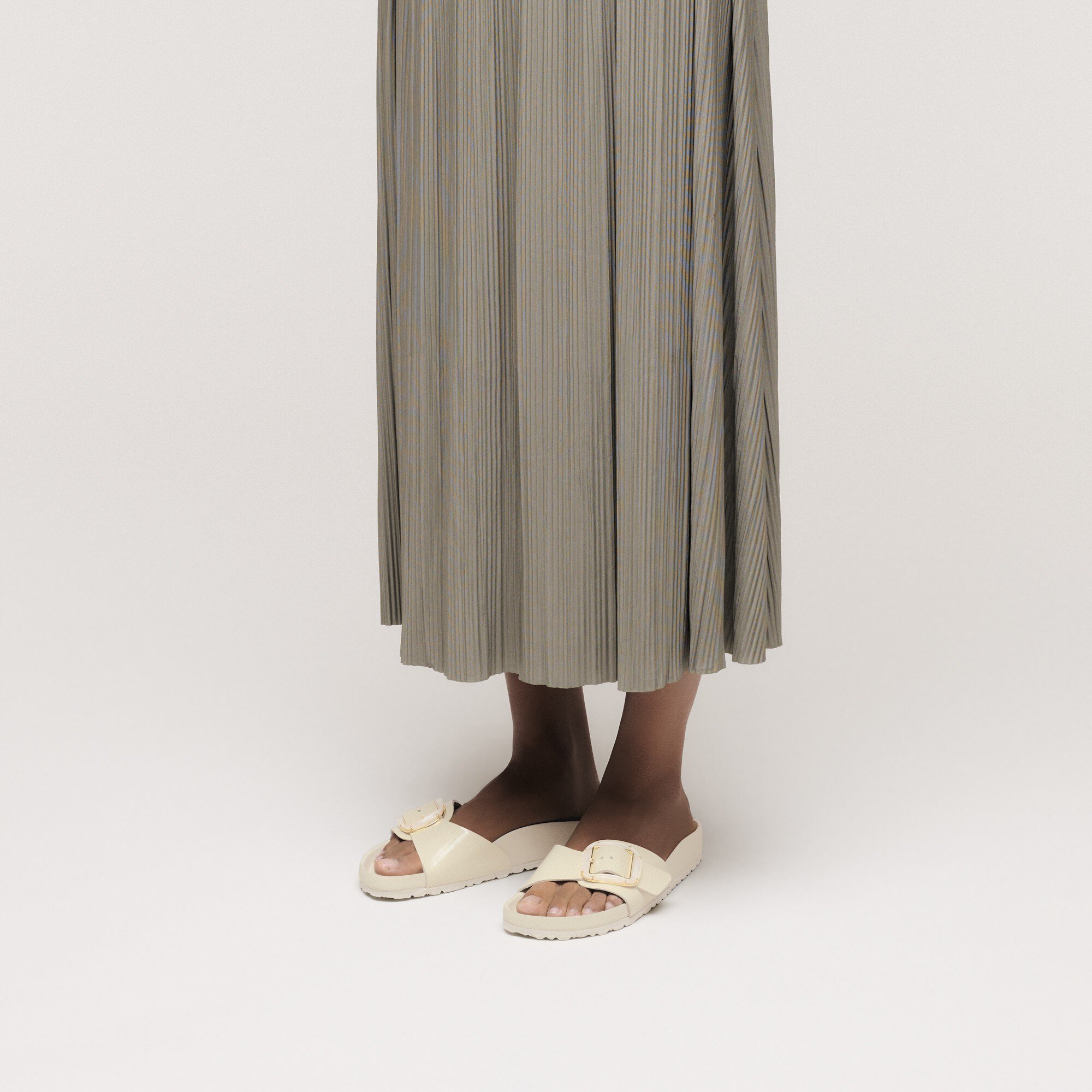 The BIRKENSTOCK Madrid is a genuine classic that delights the world of fashion with its minimalist design. The Pearl Big Buckle adds a feminine touch and ensures a luxurious look. With its shiny design and delicate metal bead details, it creates a stylish look and becomes a real eye-catcher. The color-coordinated details round off the shoe’s look of sophistication. The exquisite footbed is fully lined with soft piumato leather, making it exceptionally comfortable. The upper is made from high-quality natural leather with a shiny patent coating.