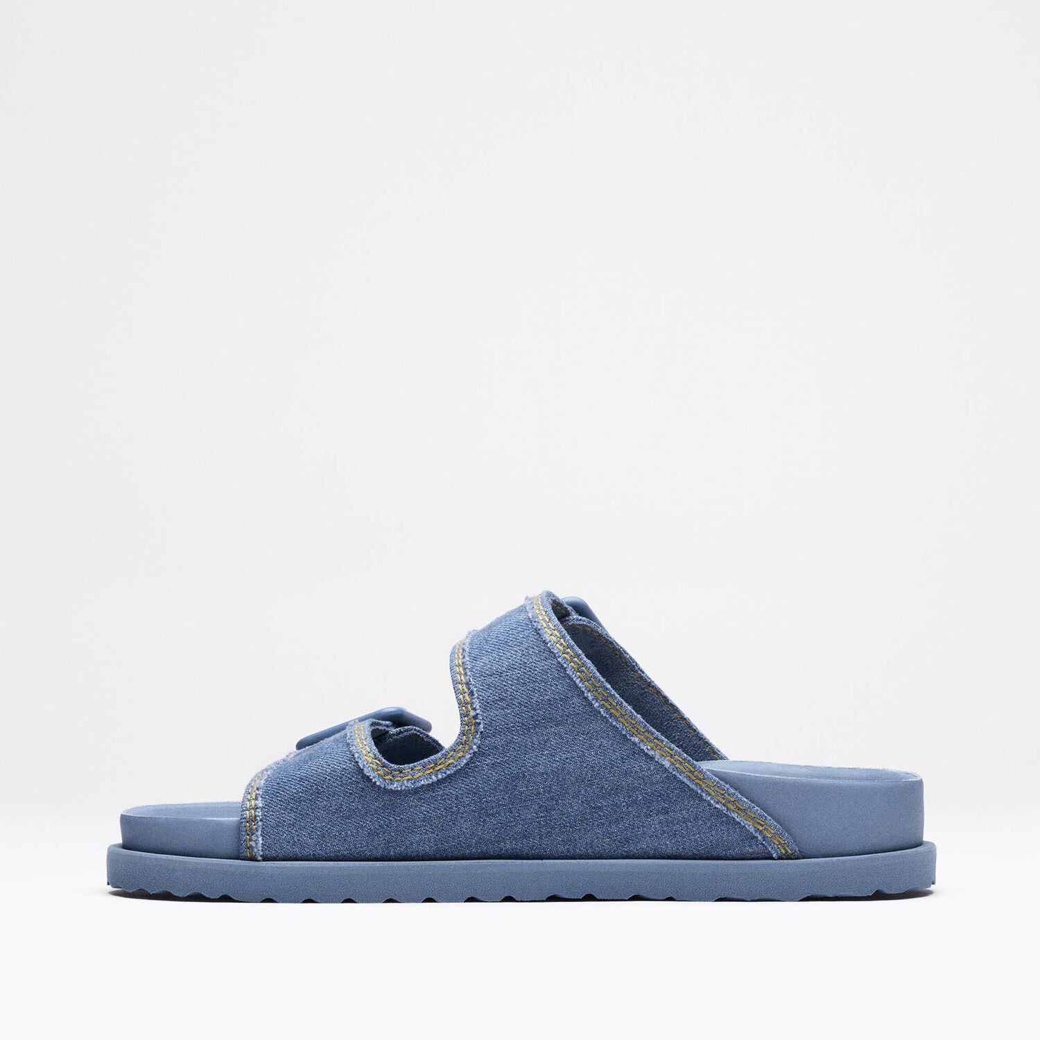 Upper: Stone-washed denim with tonal stitching, tonal suede lining, contrast stitching. The dark wash denim is presented with red contrast stitching and the light wash denim with yellow contrast stitching