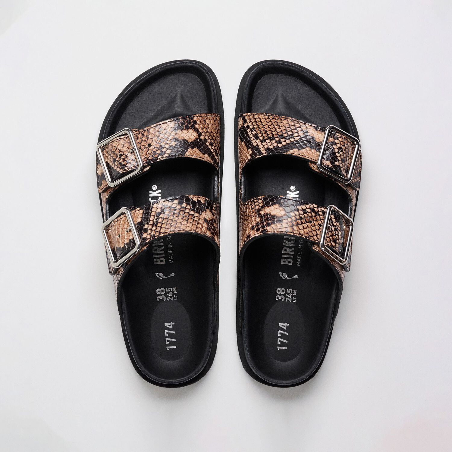 The Arizona is redesigned in deluxe Italian leather with all-over python embossing, all lined in soft nappa leather. The collection’s colours accentuate the vibrant patterns of the snake in beige and red with BIRKENSTOCK’s signature anatomically shaped footbed covered in black leather, and each pair is adorned with 1774’s distinctive buckles in gold or silver finishes.