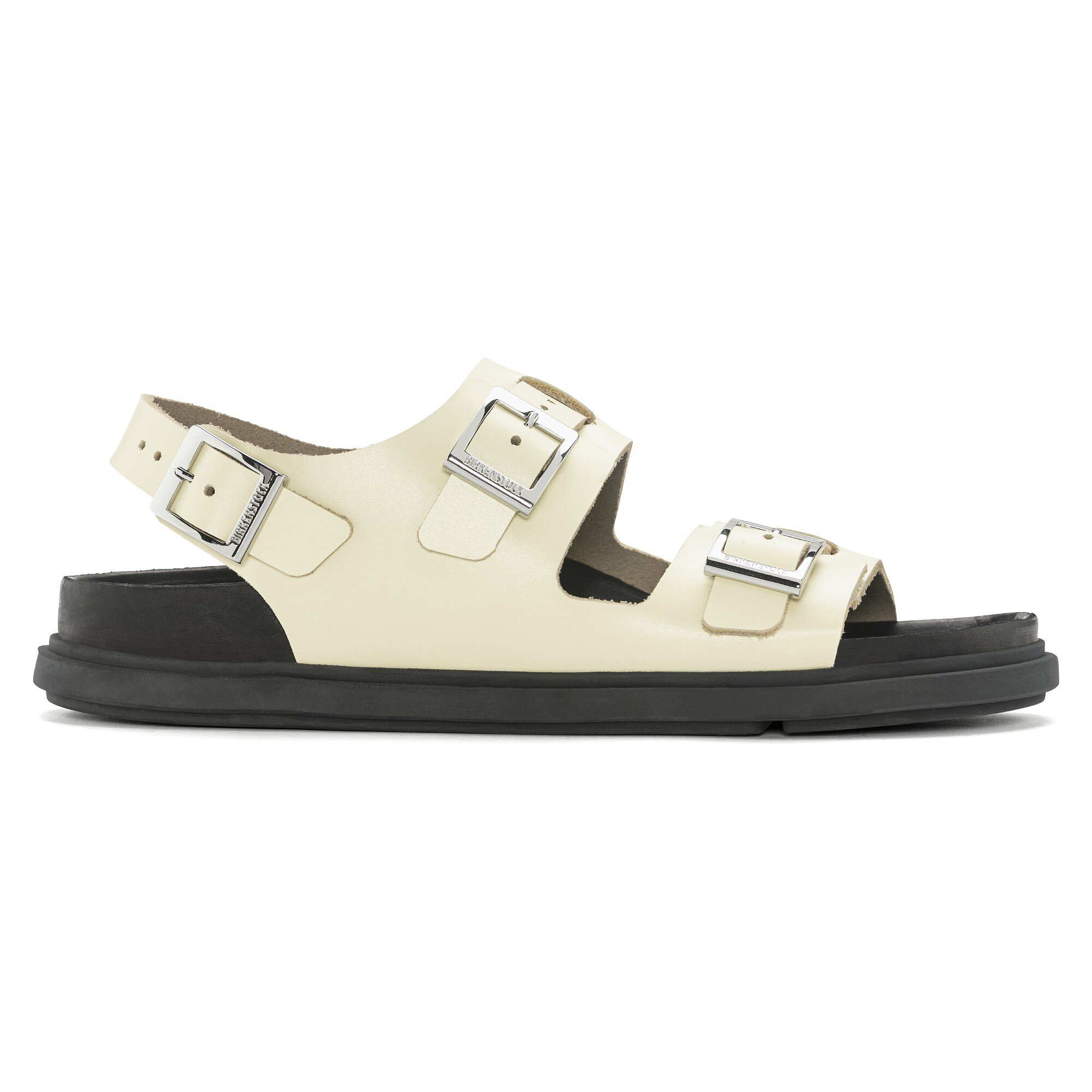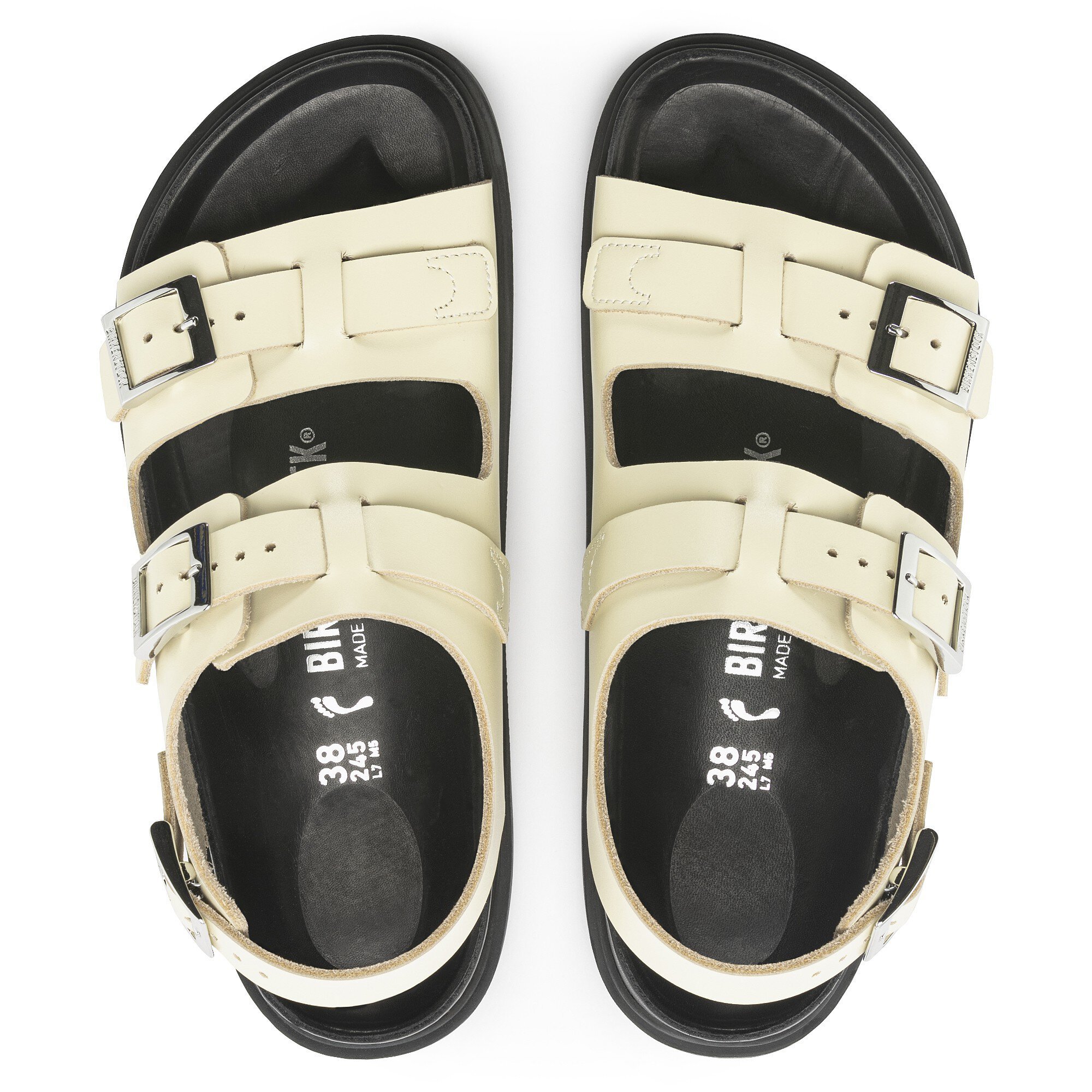 The BIRKENSTOCK Cannes is a puristic and modern style. It makes an impression with its delicate, premium look and its feminine elegance. The shiny, convex Zamak buckles are a sophisticated eye-catcher. The exquisite footbed is fully lined with soft piumato leather, making it exceptionally comfortable. The discontinuous outsole in the forefoot supports the foot’s roll-off motion and offers maximum flexibility. The upper is made from high-quality, soft natural leather.