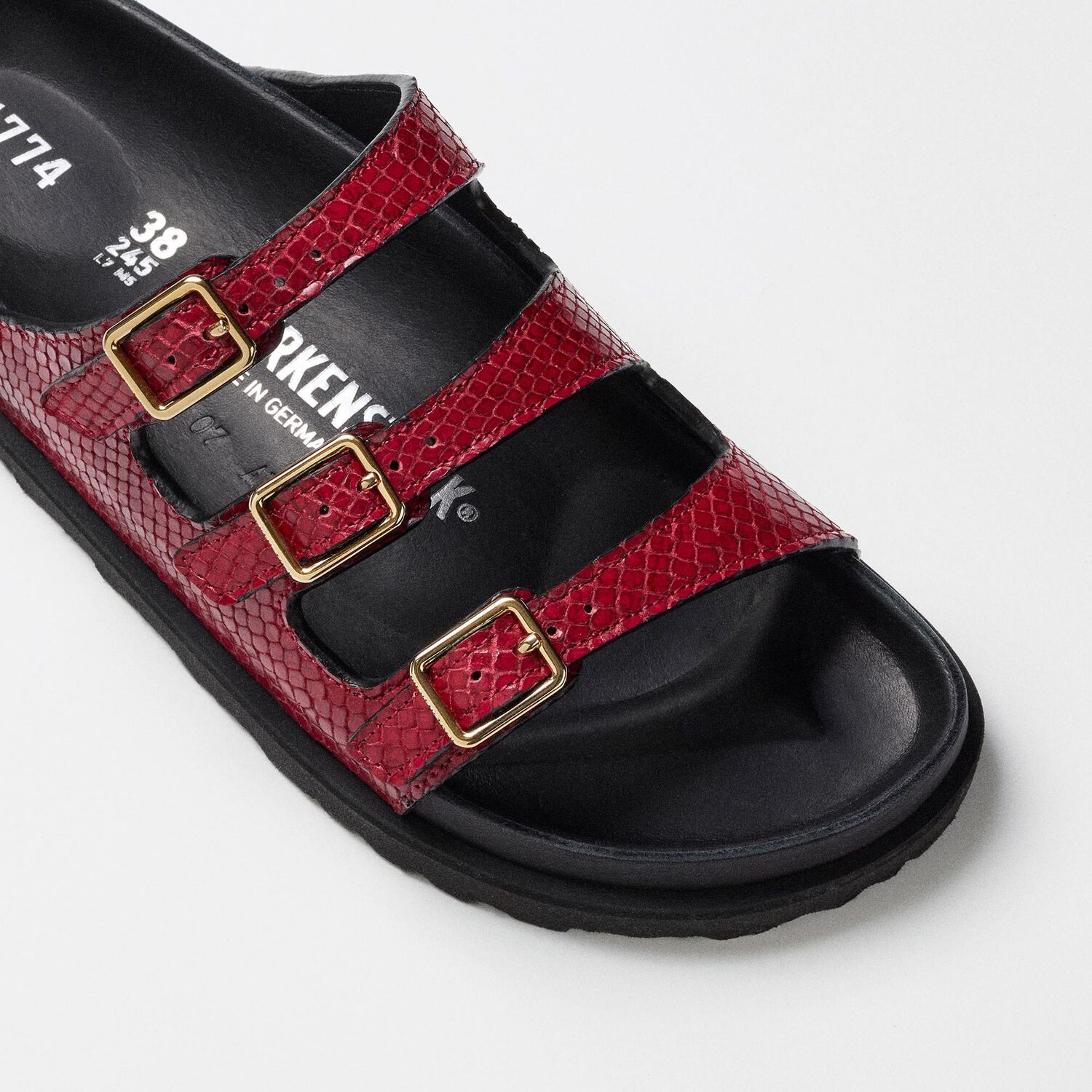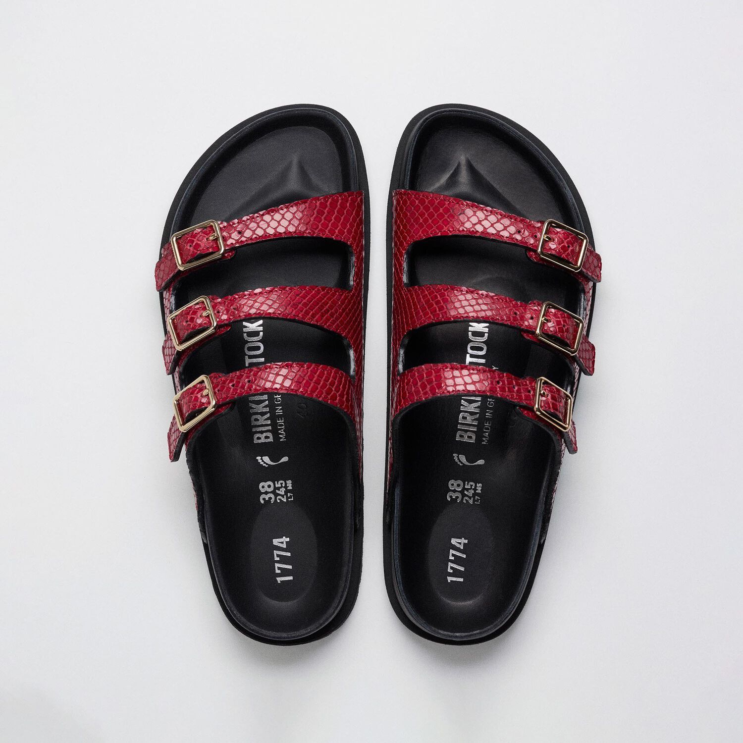 In celebration of the Lunar New Year, BIRKENSTOCK 1774 introduces a special collection for the Year of the Snake. The Florida silhouette is crafted from premium Italian leather with python embossing and a soft nappa leather lining. The design features vibrant beige and red tones, with the signature anatomically shaped footbed in black leather, and is finished with 1774's gold or silver buckles.