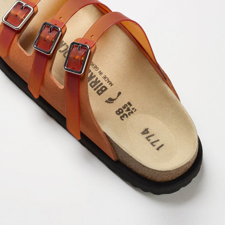 Emphasizing the harmony between function and design, 1774 once again reimagines the Florida sandal. Handcrafted in Germany from premium materials, the Florida, which is punctuated with three slender straps, comes to life with a 70’s inspired, semi-transparent PVC matte finish and premium Cazador leather on the buckle part.