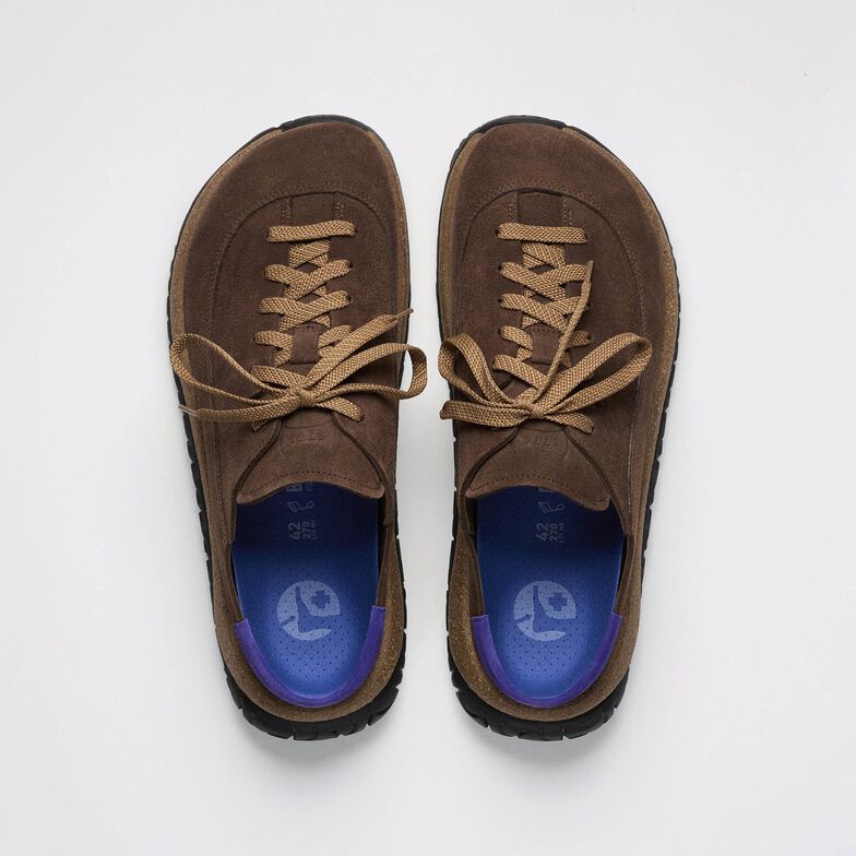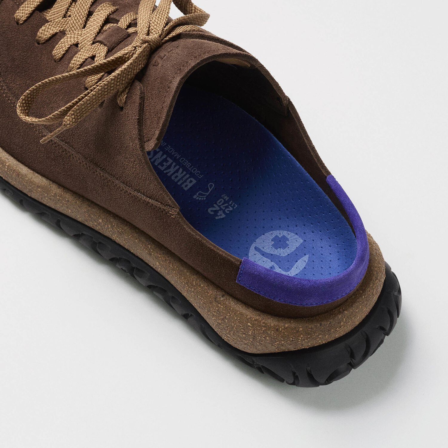 The Uerzell is a minimalist slip-on mule crafted from soft suede, featuring sleek lines, delicate lacing, and a signature exposed cork midsole a subtle nod to BIRKENSTOCK’s sandal heritage. Sculptural yet restrained, it’s offered in tonal shades of taupe, lime, and maroon making for a quietly confident statement.