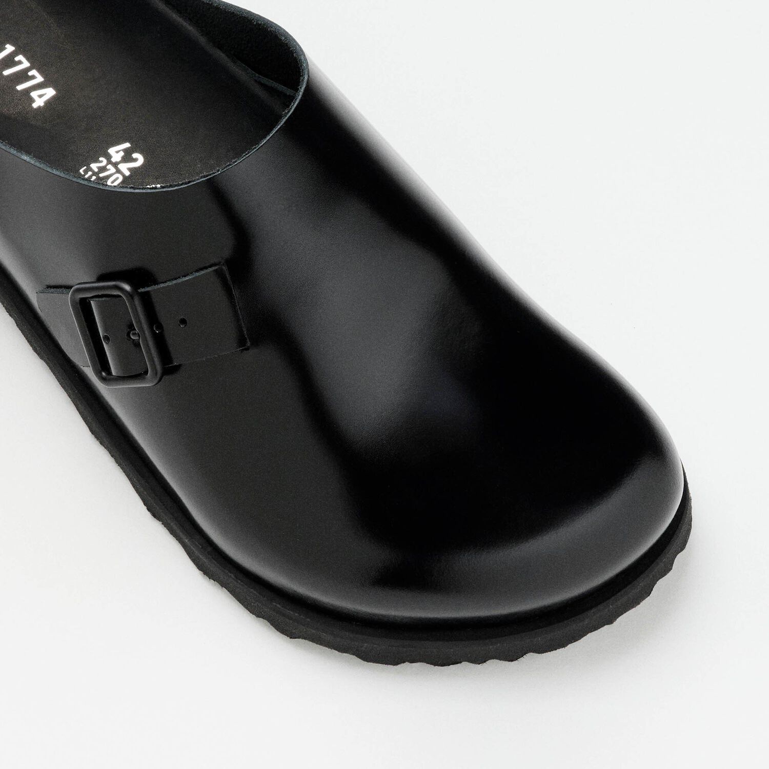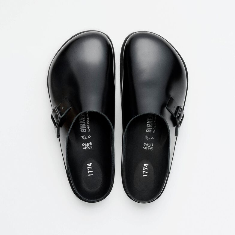 The 33 Dougal is a new silhouette created for this 1774 Collection. This new style takes its inspiration from the timeless BIRKENSTOCK Boston clog design while maintaining optimal orthopaedic support and adjustability. It boasts smooth leather with a high-shine finish and a color-matched buckle in autumnal hues: black and green moss.