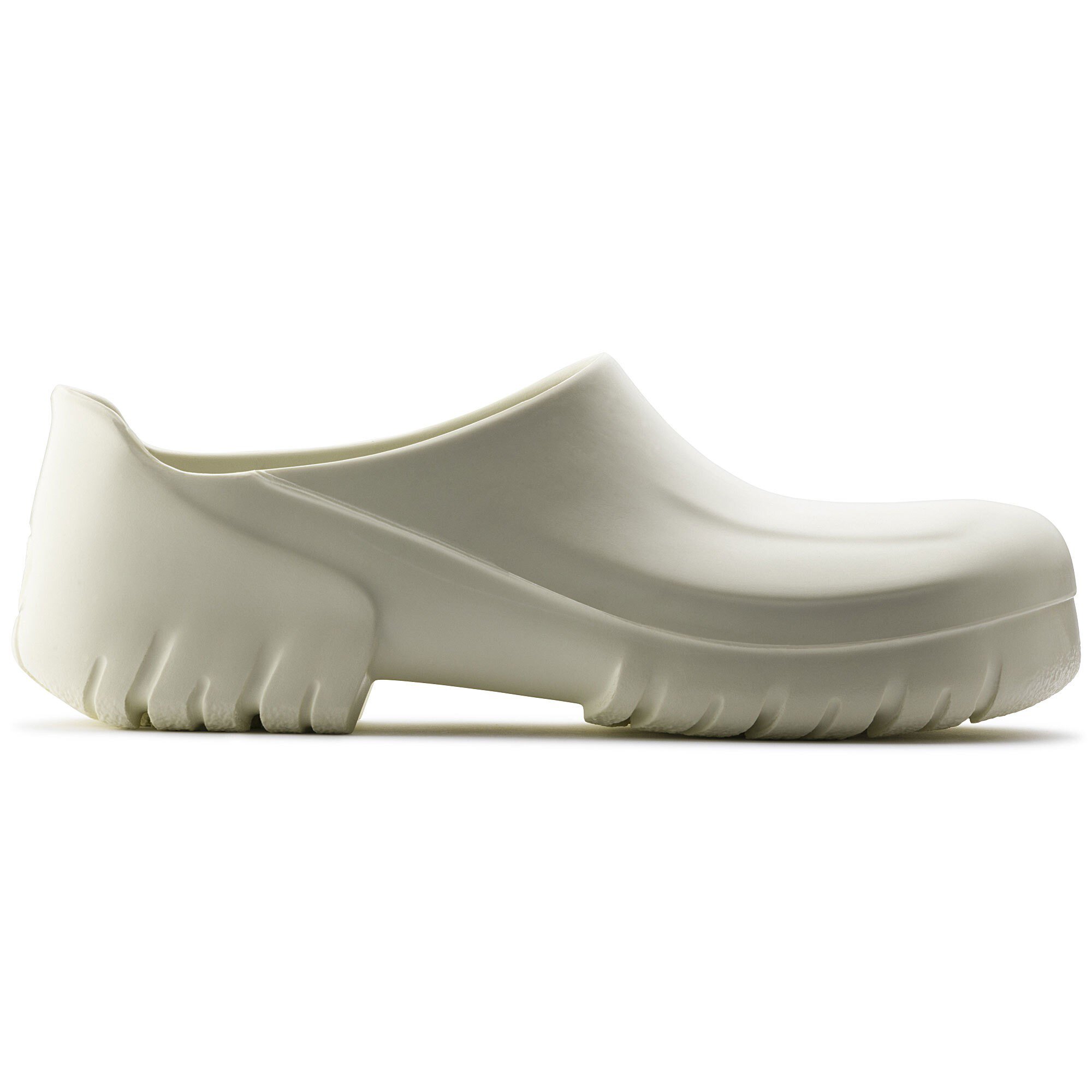 The A 630 PU clog covers all bases when it comes to stringent hygiene standards and reliable nonslip properties. Its enclosed design and the nonslip treaded sole offer reliable grip and maximum sure-footedness in kitchens and the food industry. Its oil- and grease-resistant material is also water-resistant, allowing it to be cleaned efficiently and thoroughly. This involves removing the cork-latex footbed and washing the clog at up to 80° Celsius. Both parts of the shoe are suitable for daily disinfection. The anatomically shaped original BIRKENSTOCK footbed protects joints and tendons, and is also washable at up to 30° Celsius. The footbed is available separately and can therefore be replaced if necessary. The A 630 model is certified in accordance with EN ISO 20347:2012 OB E (SRC category).