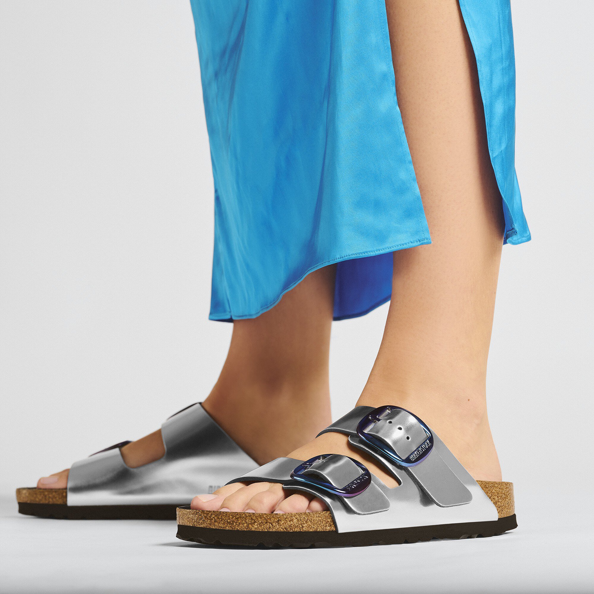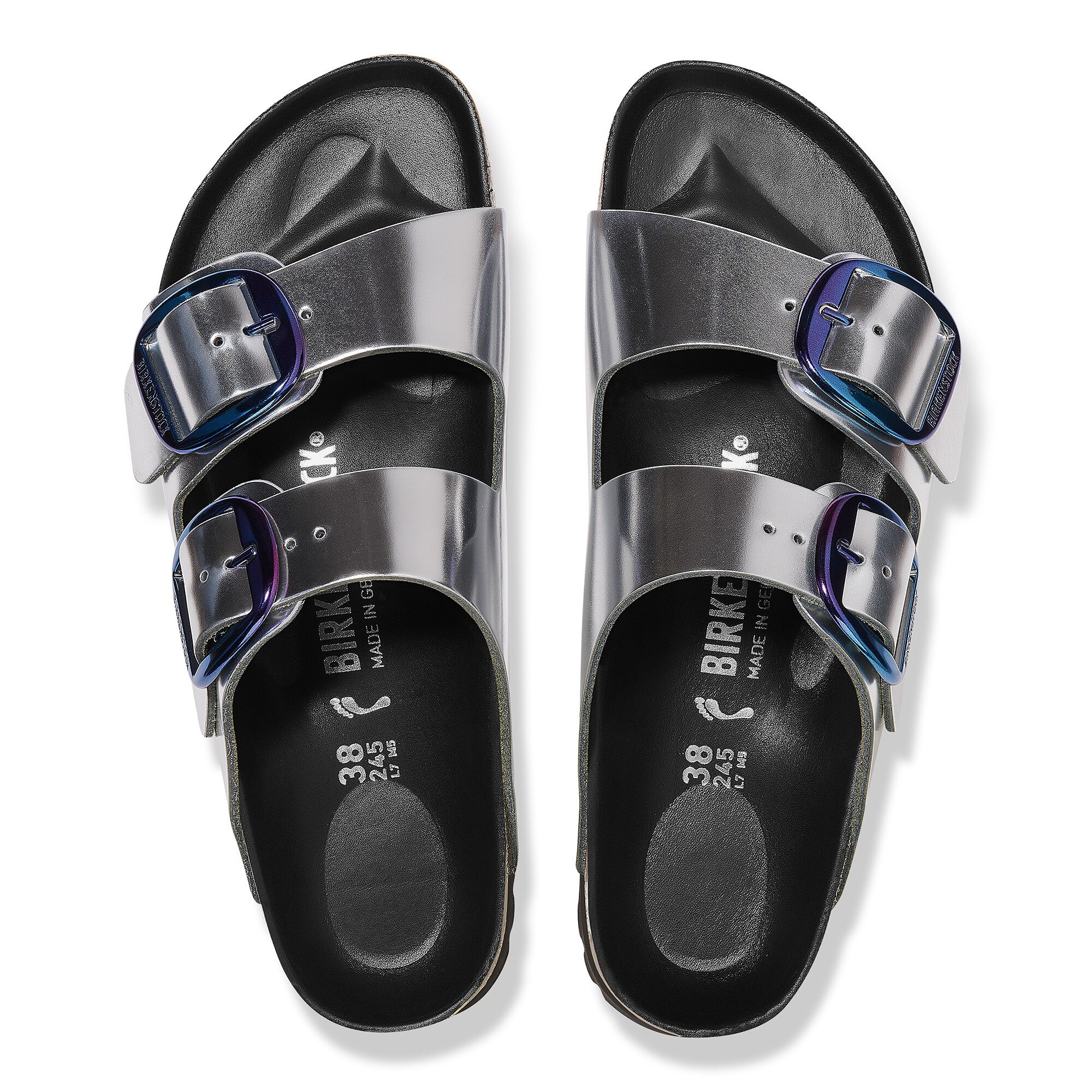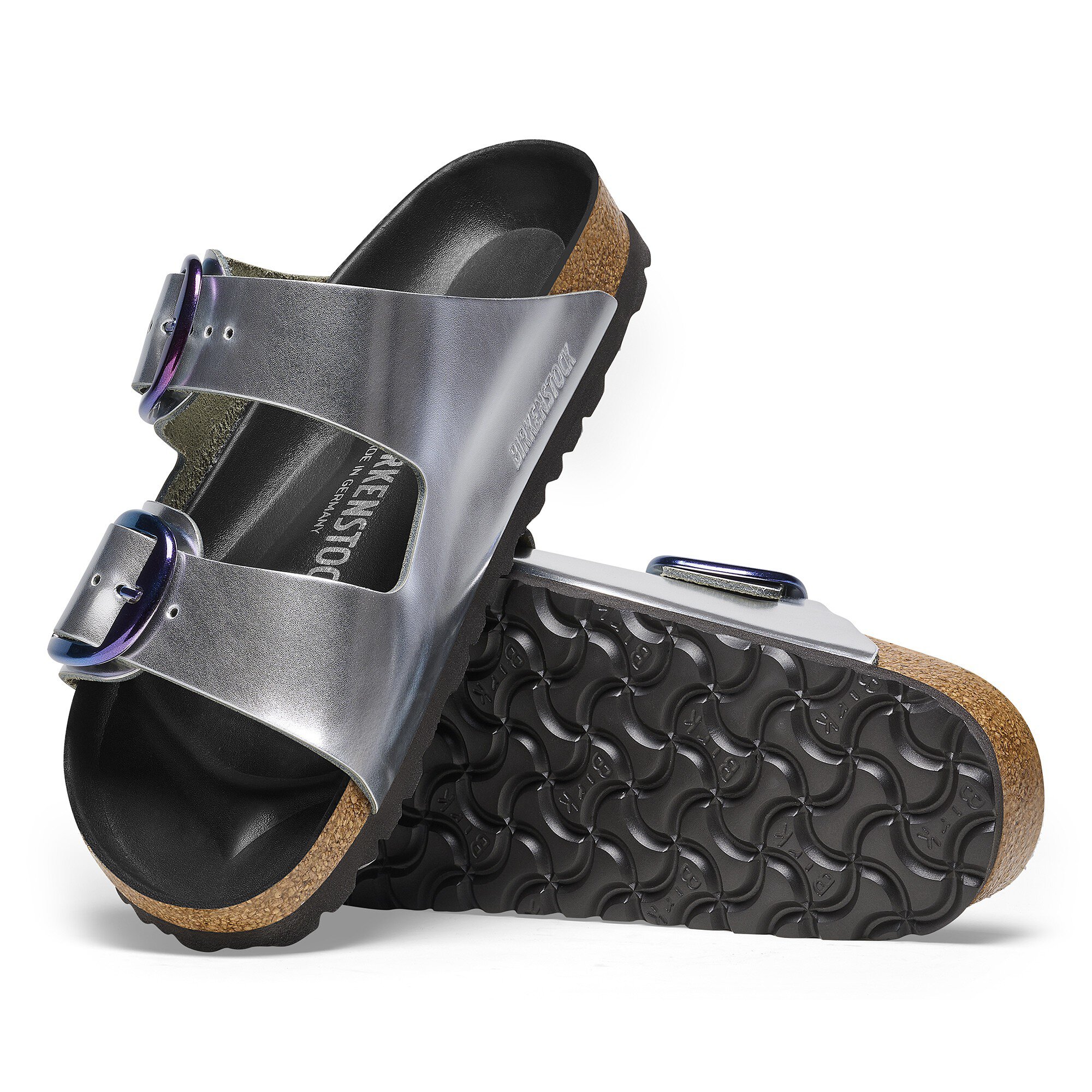 The BIRKENSTOCK Arizona is a genuine classic that has been delighting both men and women with its timeless design for decades. This version brings two popular designs together. It boasts a metallic look and a big, elegant pin buckle. The reflecting look and iridescent buckles make the classic model shine. The semi-exquisite footbed is lined with soft piumato leather leather and matches the shoe in color. The upper is made from high-quality, soft natural leather.