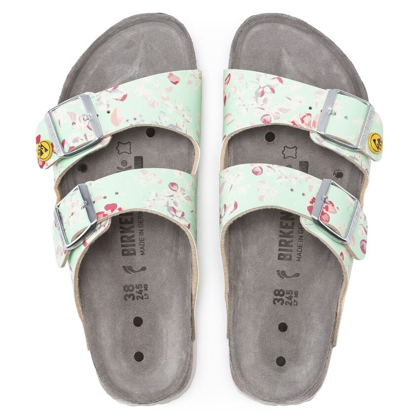 The BIRKENSTOCK Arizona is a genuine classic that has been delighting both men and women for decades. This simple sandal with two straps stands for timeless design and is also perfect for daily use at work thanks to its comfort factor. Due to its additional ESD properties to combat spontaneous electrostatic discharge, this model is ideal for wearing in ESD areas. The combination of the footbed and the specially developed sole guarantees permanently gentle discharge and protects sensitive parts. All BIRKENSTOCK ESD models are tested in accordance with the requirements of DIN EN 61340 and meet the ESD requirements of 1.0 × 105 to 3.5 × 107 ohms. The upper is made from the skin-friendly, hard-wearing synthetic material Birko-Flor®.