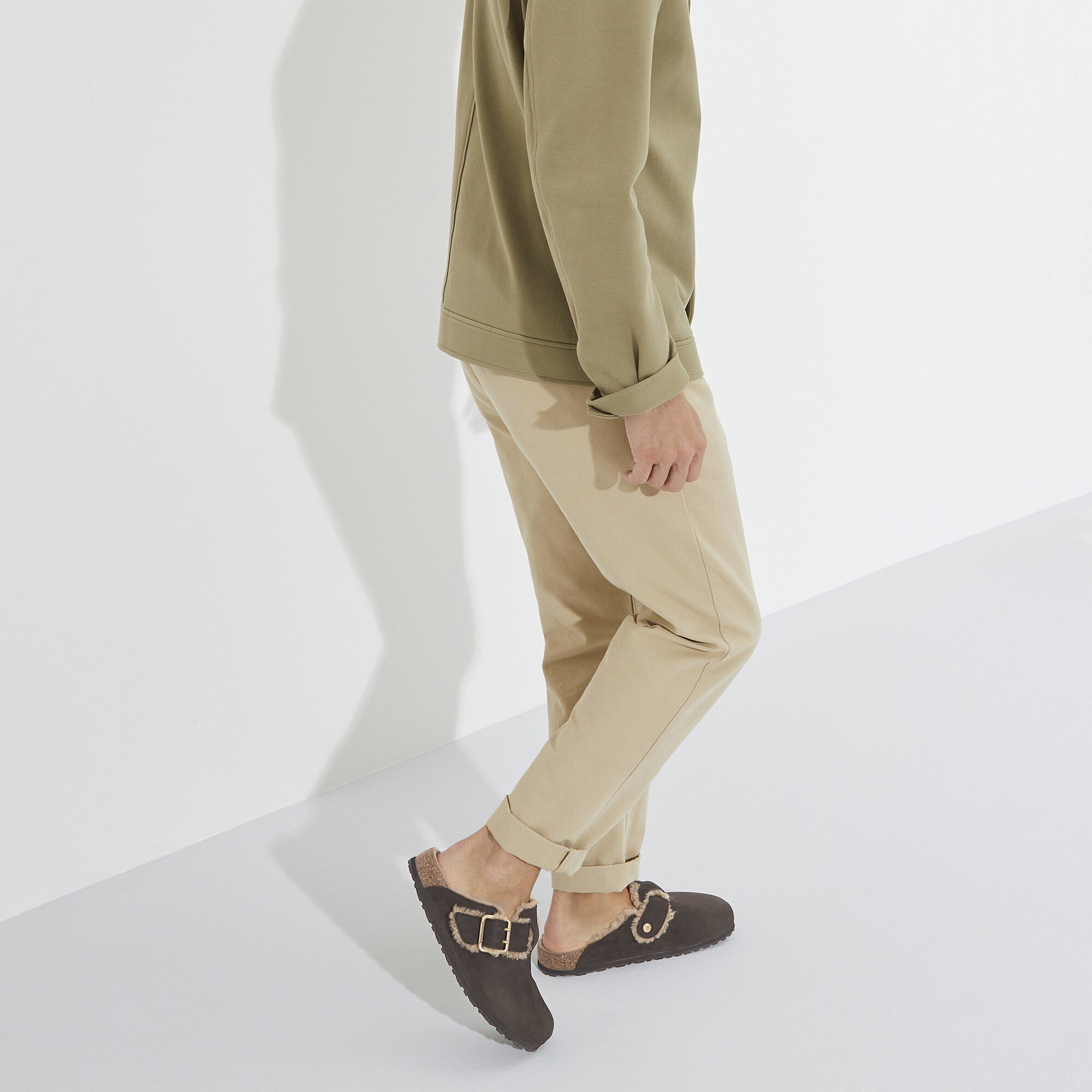 The BIRKENSTOCK Boston clog is a veritable classic that can easily be worn all year round. This version is modern and urban. The curly lambskin complemented by brass buckles is a genuine eye-catcher. Thanks to its two components, the sole promotes stability and comfort. It comprises a cushioning midsole made from EVA and an outsole made from genuine rubber and rounds off the look. The upper is made from high-quality, soft nubuck leather.