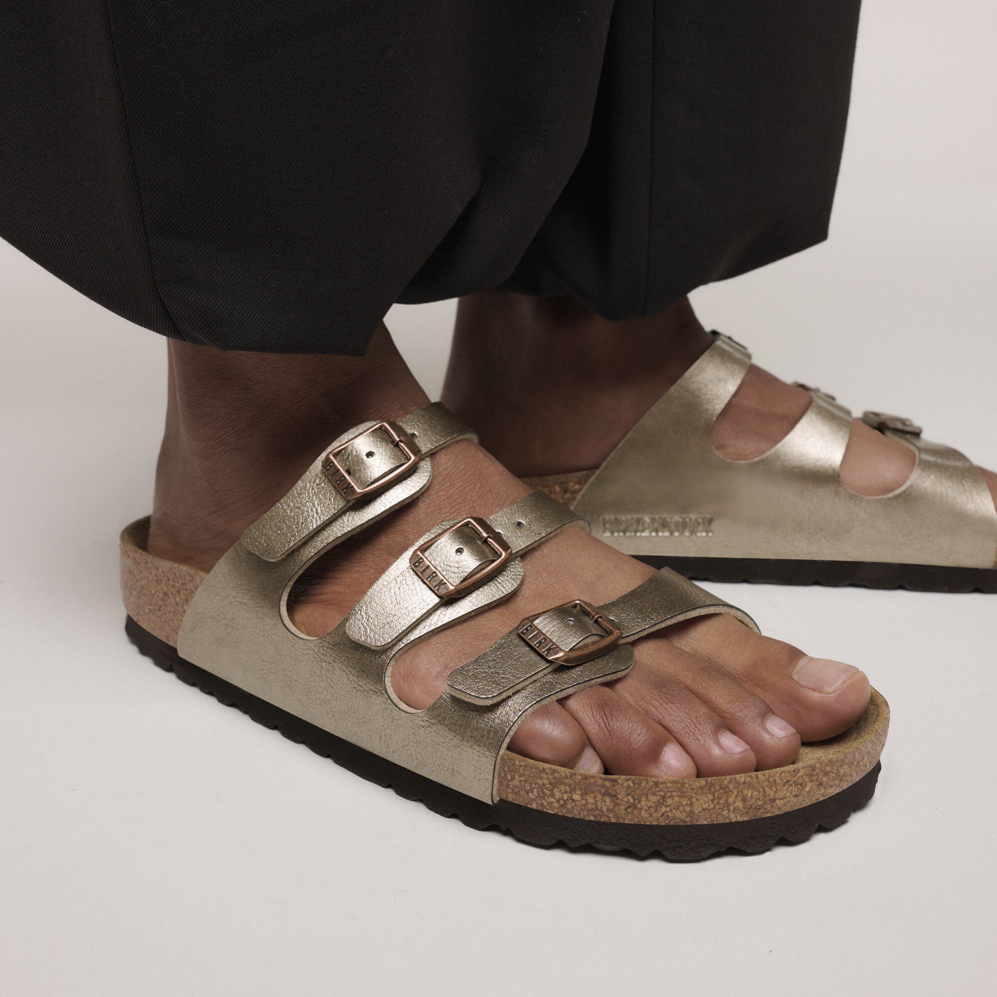 The BIRKENSTOCK Florida is the ideal sandal for anyone who spends a lot of time on their feet. This three-strap sandal offers good grip and maximum comfort. This sandal version has a silky sheen finish. The upper is made from the skin-friendly, hard-wearing synthetic material Birko-Flor®.