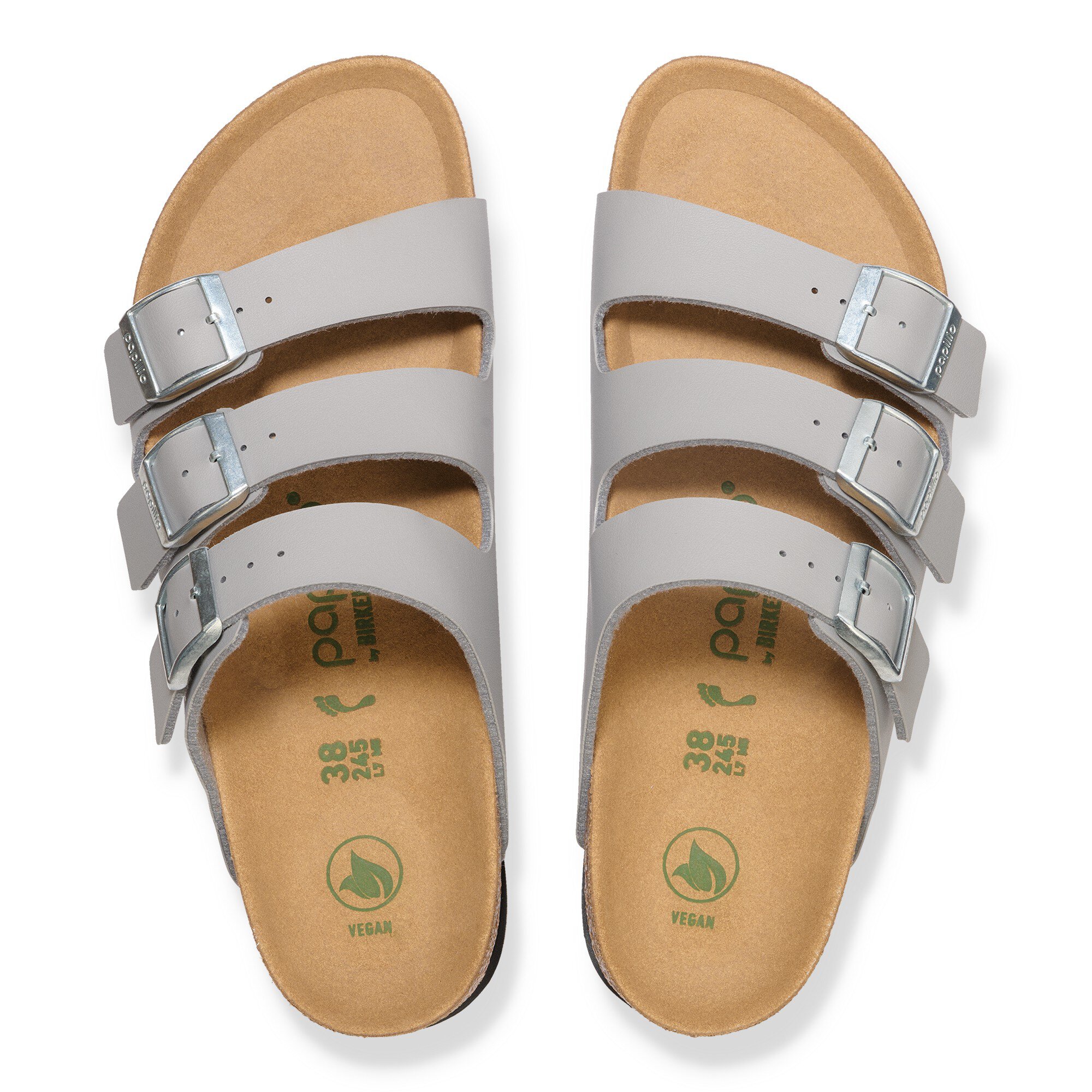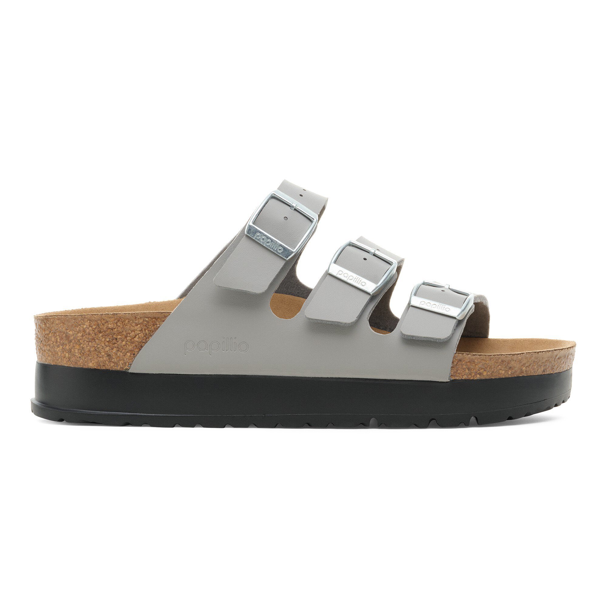 The BIRKENSTOCK Florida is the ideal sandal for anyone who spends a lot of time on their feet. Here, Papillio presents the three-strap sandal with a trendy platform sole. The new platform flex outsole has a wider heel section for increased stability and ideal weight distribution. This popular sandal has been given an update in a new material, with a vegan version now available. It is entirely free of animal products, as verified by independent testing laboratories. The updated design with horizontal grooves in the front part improves flexibility and the rolling motion. The upper is made from the skin-friendly, hard-wearing synthetic material Birko-Flor®.