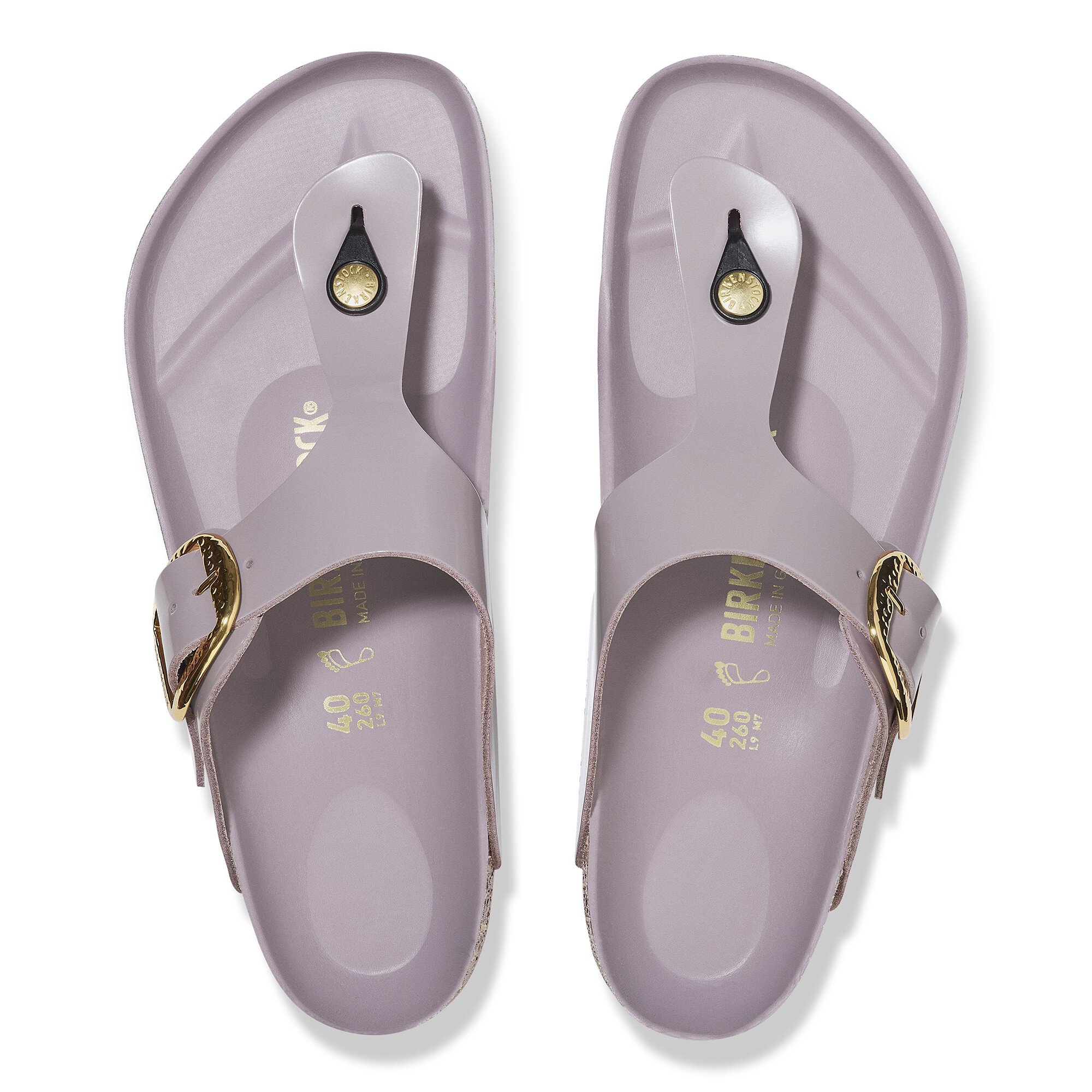 The BIRKENSTOCK Gizeh is a genuine classic and a stylish all-rounder. Our elegant thong sandal combines optimum grip with minimalist, fashionable design. The Big Buckle Hammered version is unmistakable with its large, elegant pin buckles and hand-hammered design. An impressive and distinctive eye-catcher on this otherwise understated sandal. The semi-exquisite footbed is fully lined with soft piumato leather, making it exceptionally comfortable. The upper is made from high-quality natural leather with a shiny patent coating.