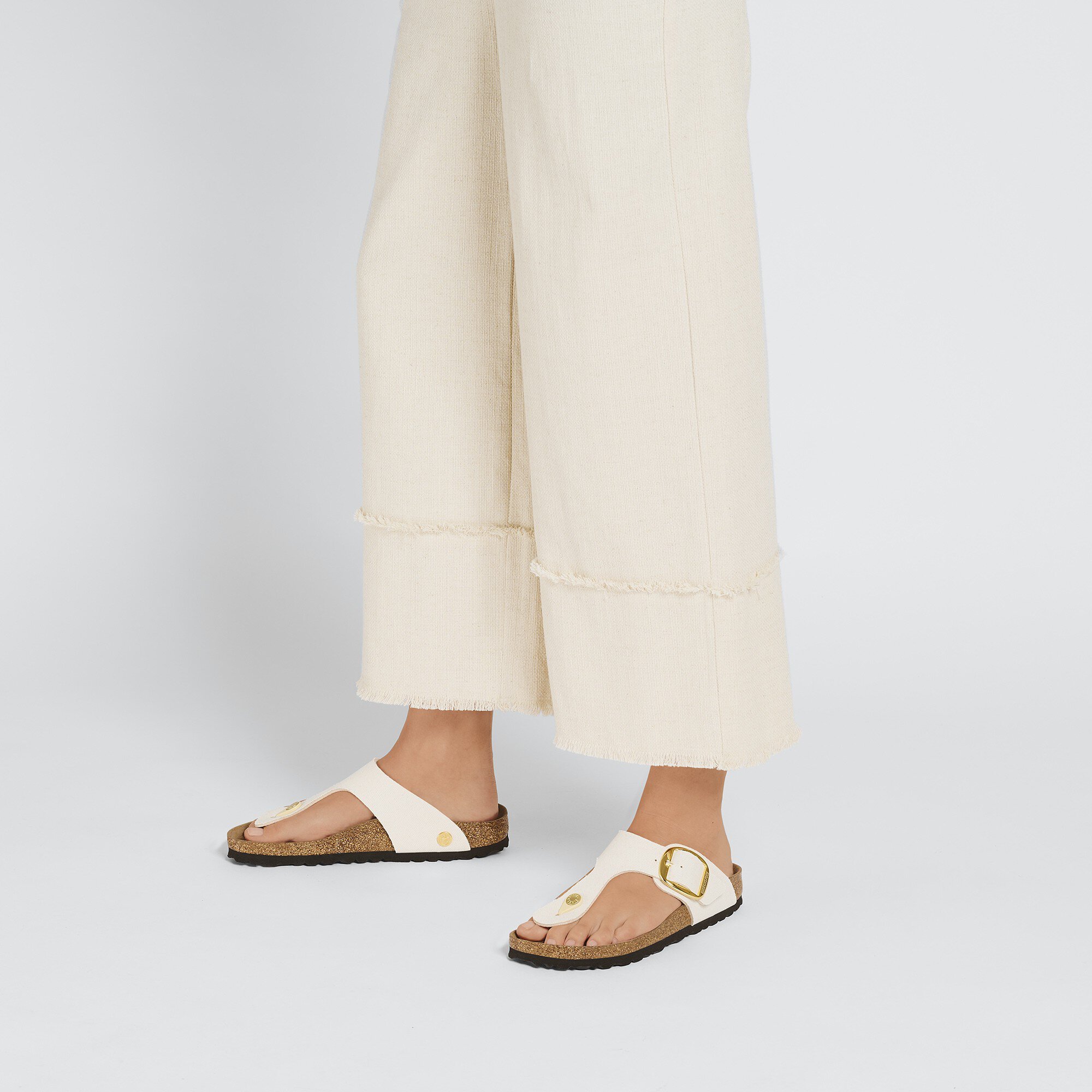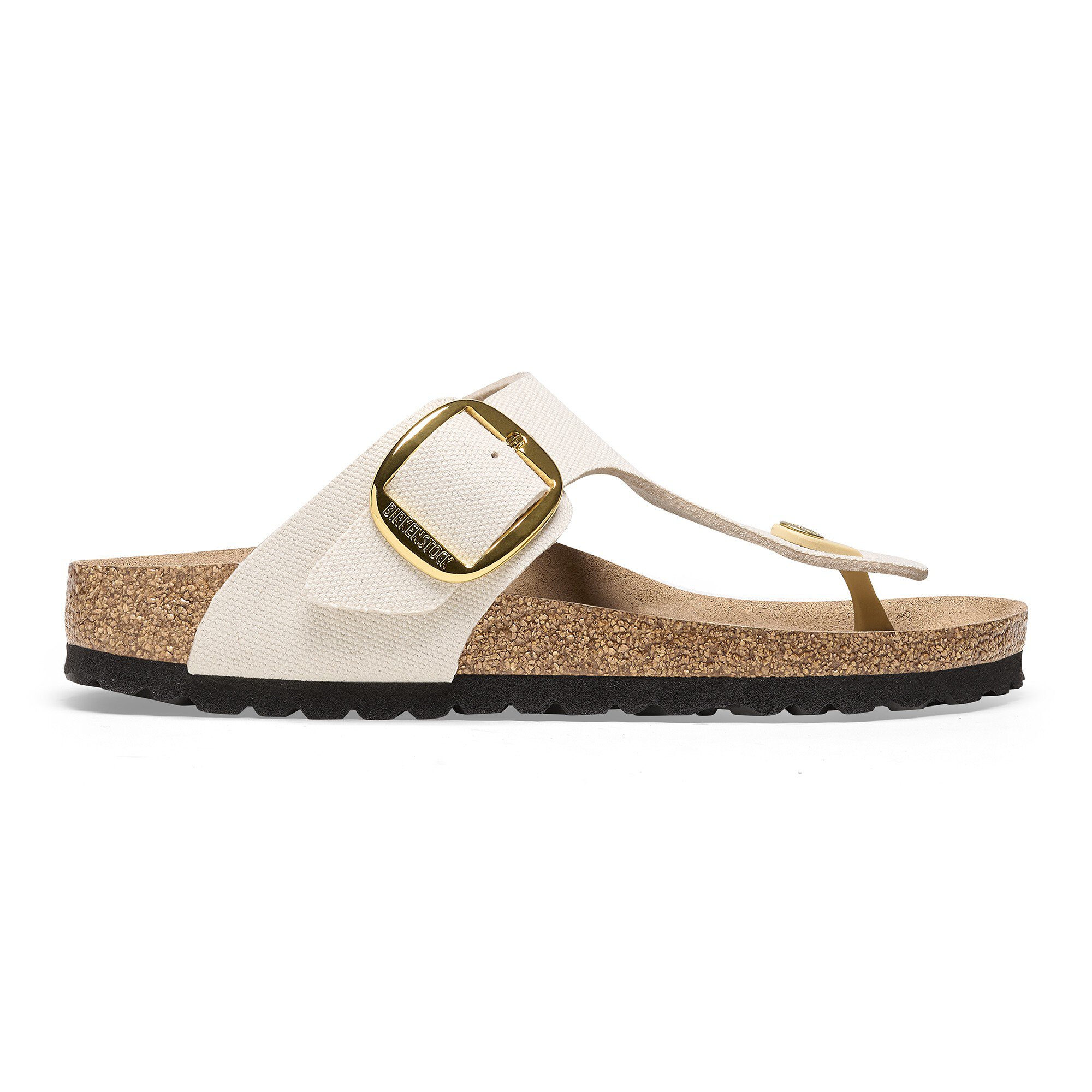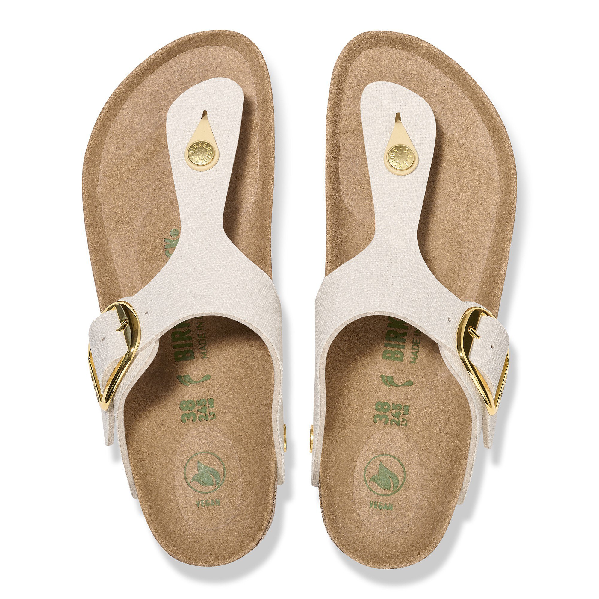 The BIRKENSTOCK Gizeh is a genuine classic that combines optimum grip with minimalist, fashionable design. This version comes with our popular Big Buckle. This sandal has been given an update in a new material, with a vegan version now available. It is entirely free of animal products, as verified by independent testing laboratories. The upper is made from a soft fabric.