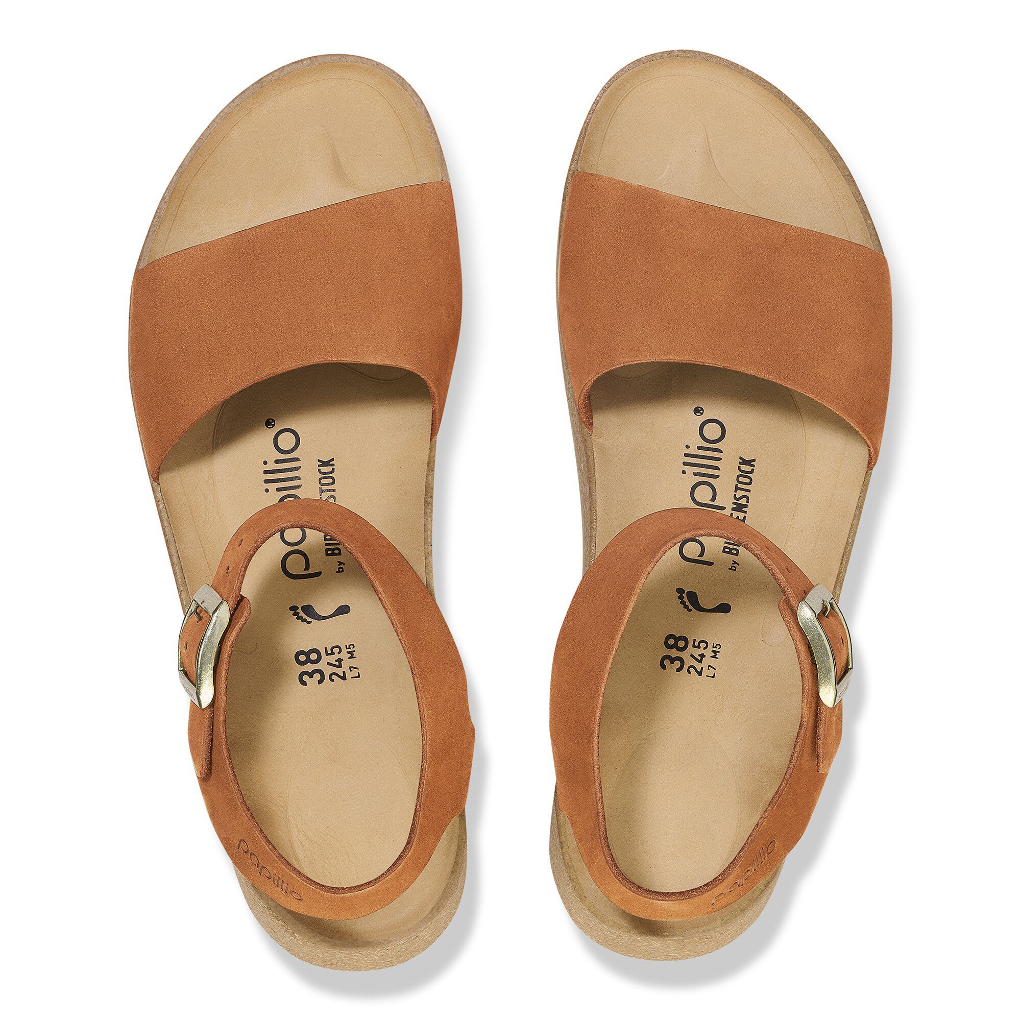 The Glenda sandal from Papillio is a platform sandal with a slight, flared wedge heel and sunken footbed. Its optimum stability thanks to the wide strap at the instep and supporting ankle strap makes it a real hit with women who want both high fashion and comfort. Despite its robustness, it has a feminine appearance. The upper is made from high-quality, soft nubuck leather that boasts a natural, rustic appearance.