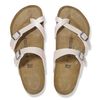 The BIRKENSTOCK Mayari thong sandal is a jaunty model with a toe loop. The impressive combination of design and wearability will see fashion-conscious men and women through the day with elegance and comfort. This version features an iridescent, silky sheen. The Saffiano embossing is reminiscent of the iconic crosshatch pattern familiar from luxury leather accessories. The upper is made from the skin-friendly, hard-wearing synthetic material Birko-Flor®, which has been embossed.