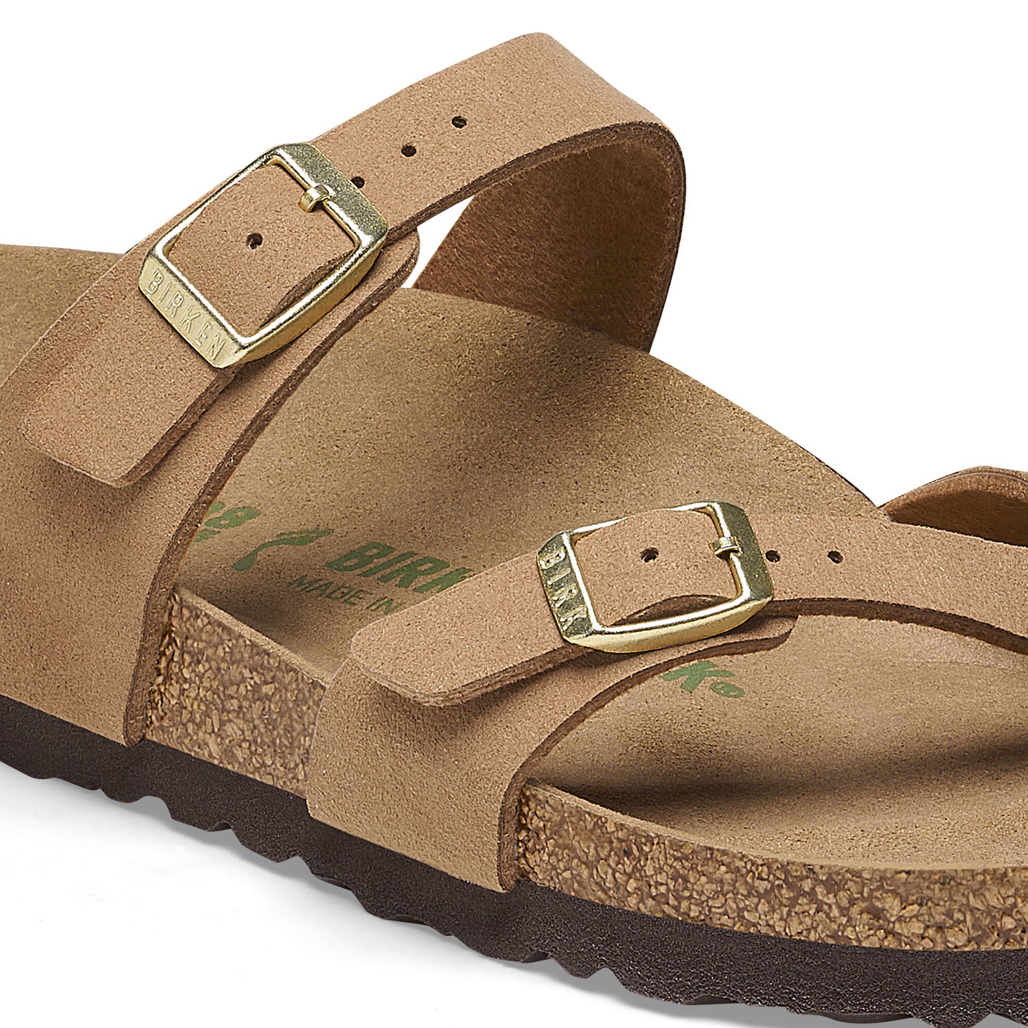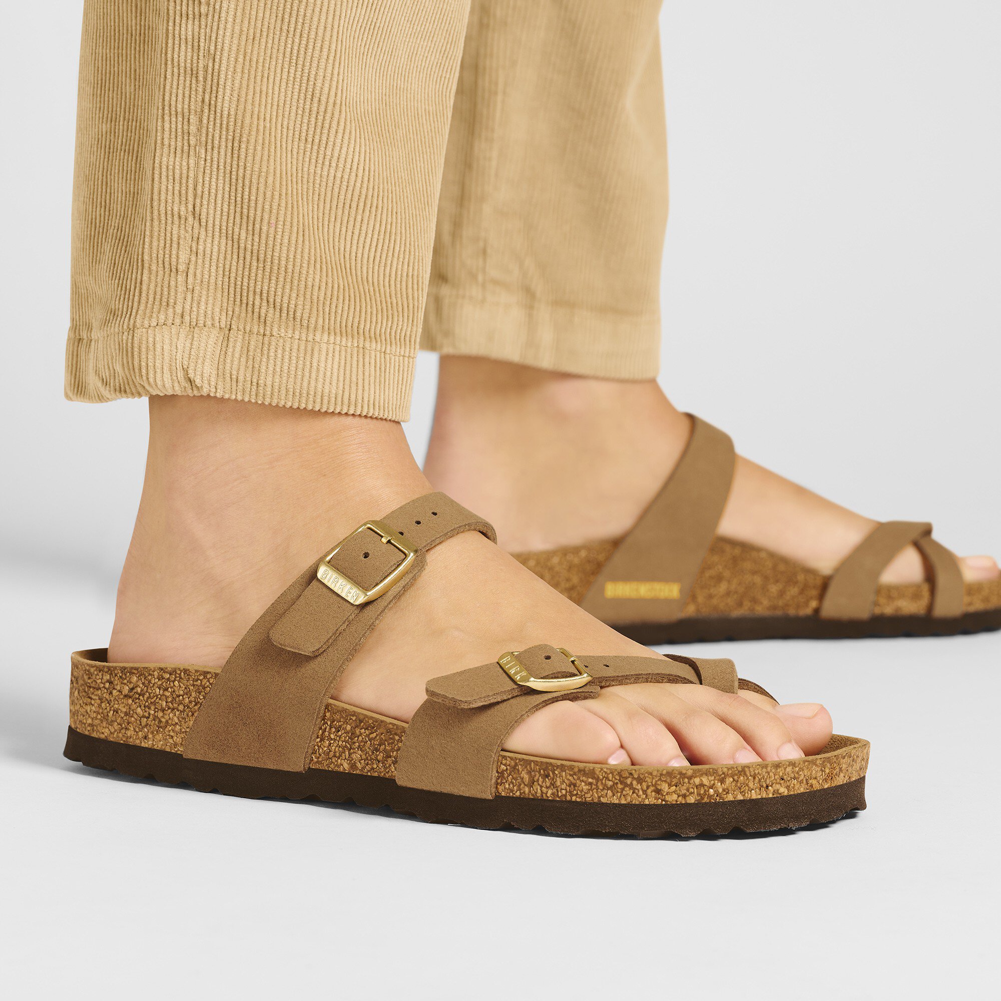 Jaunty and modern! The BIRKENSTOCK Mayari thong sandal stands out with its flowing look and brings together design and comfort. This popular sandal has been given an update in a new material, with a vegan version now available. It is entirely free of animal products, as verified by independent testing laboratories. The upper is made from a skin-friendly, synthetic material with a velvety feel.