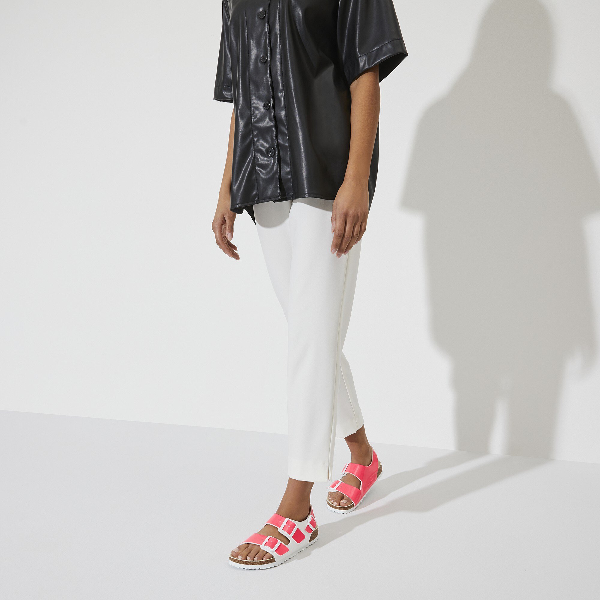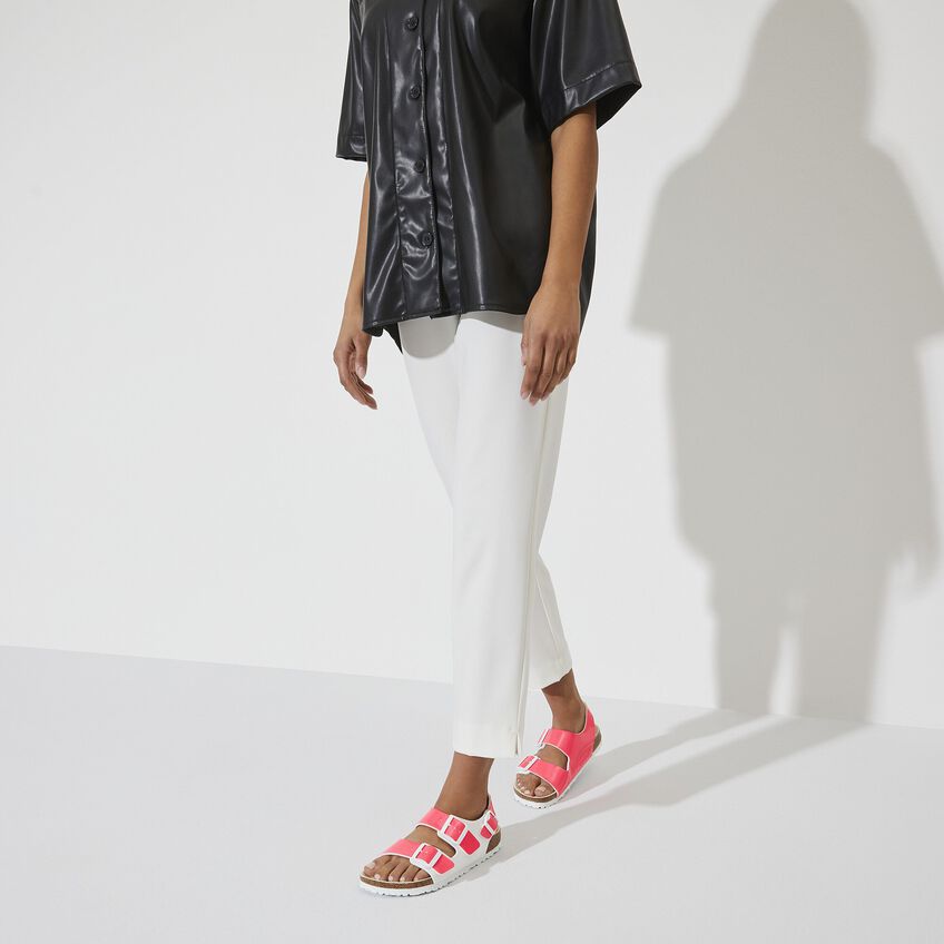 Maximum grip, stability, and a perfect fit! The BIRKENSTOCK Milano offers all of this thanks to its compact design with an ankle strap. This version features bold neon colors. This popular sandal has been given an update in a new material, with a vegan version now available. It is entirely free of animal products, as verified by independent testing laboratories. The upper is made from the skin-friendly, hard-wearing synthetic material Birko-Flor® with a shiny patent coating.