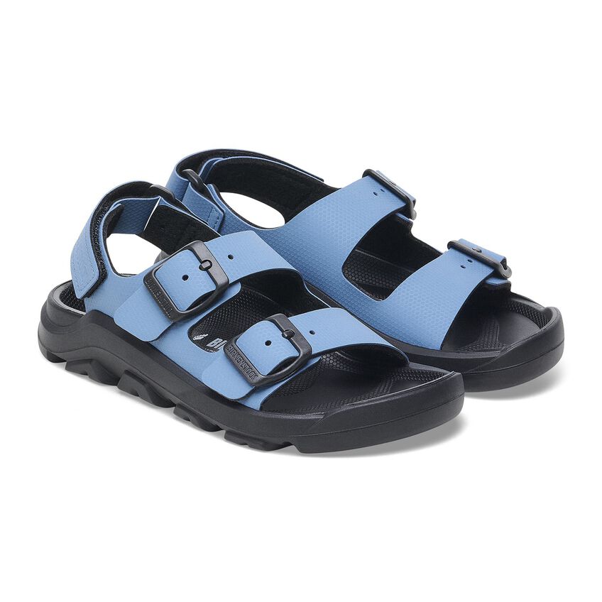 The perfect sandal for the playground, exploring forests, running across meadows, and jumping into puddles! The BIRKENSTOCK Mogami is the perfect match for adventures of any kind thanks to the waterproof footbed with toe protection and the highly functional sole which is injected into the footbed and upper in two layers. This makes the sandal extremely flexible and durable in any terrain. This version boasts vibrant colors. The upper is made from the skin-friendly, hard-wearing synthetic material Birko-Flor®.