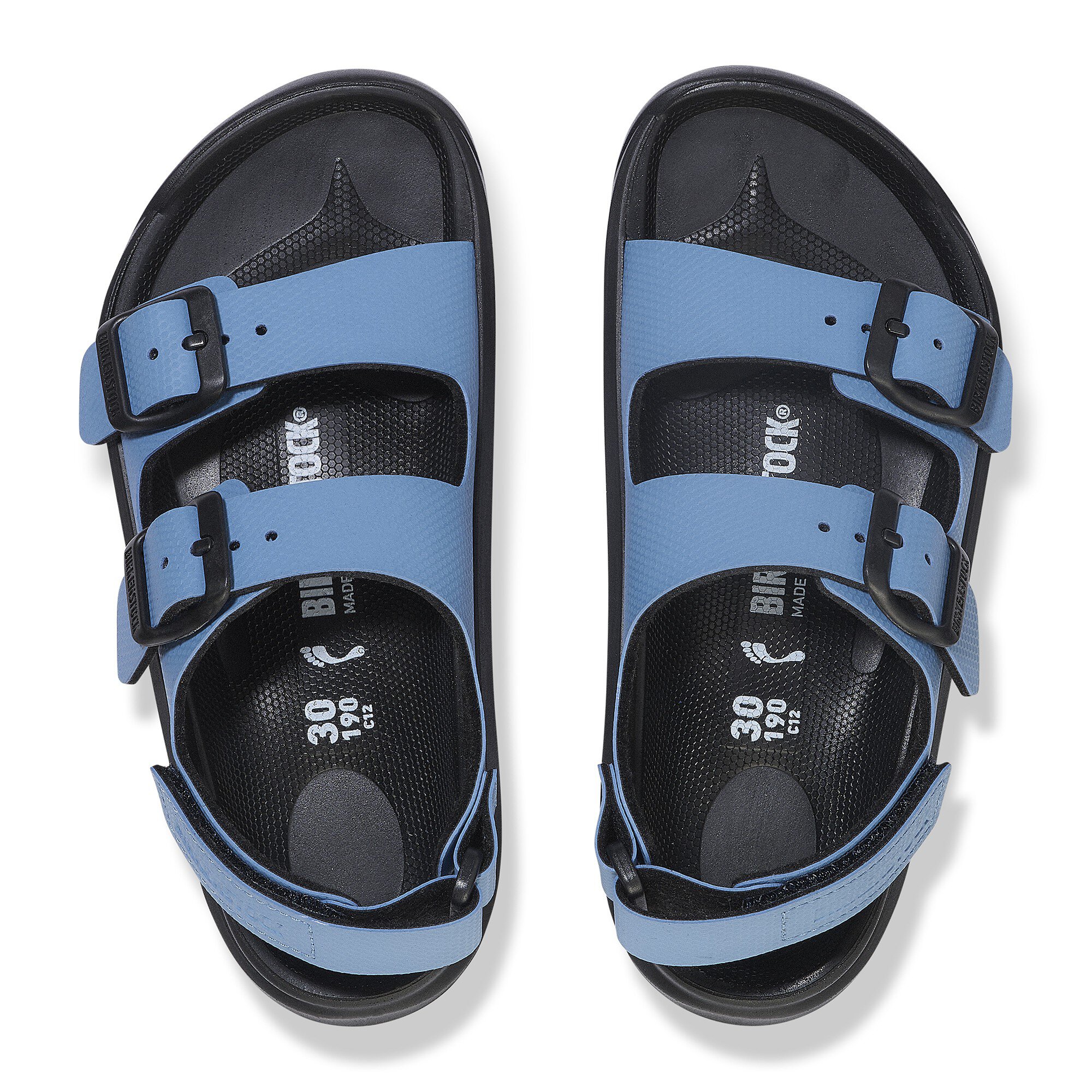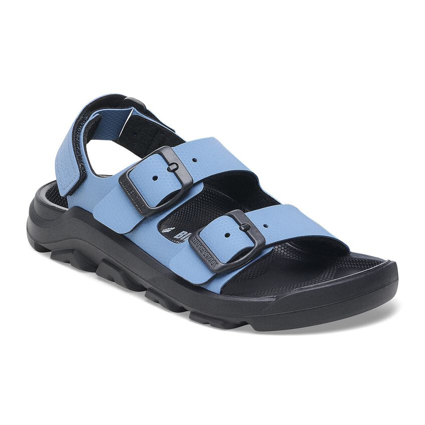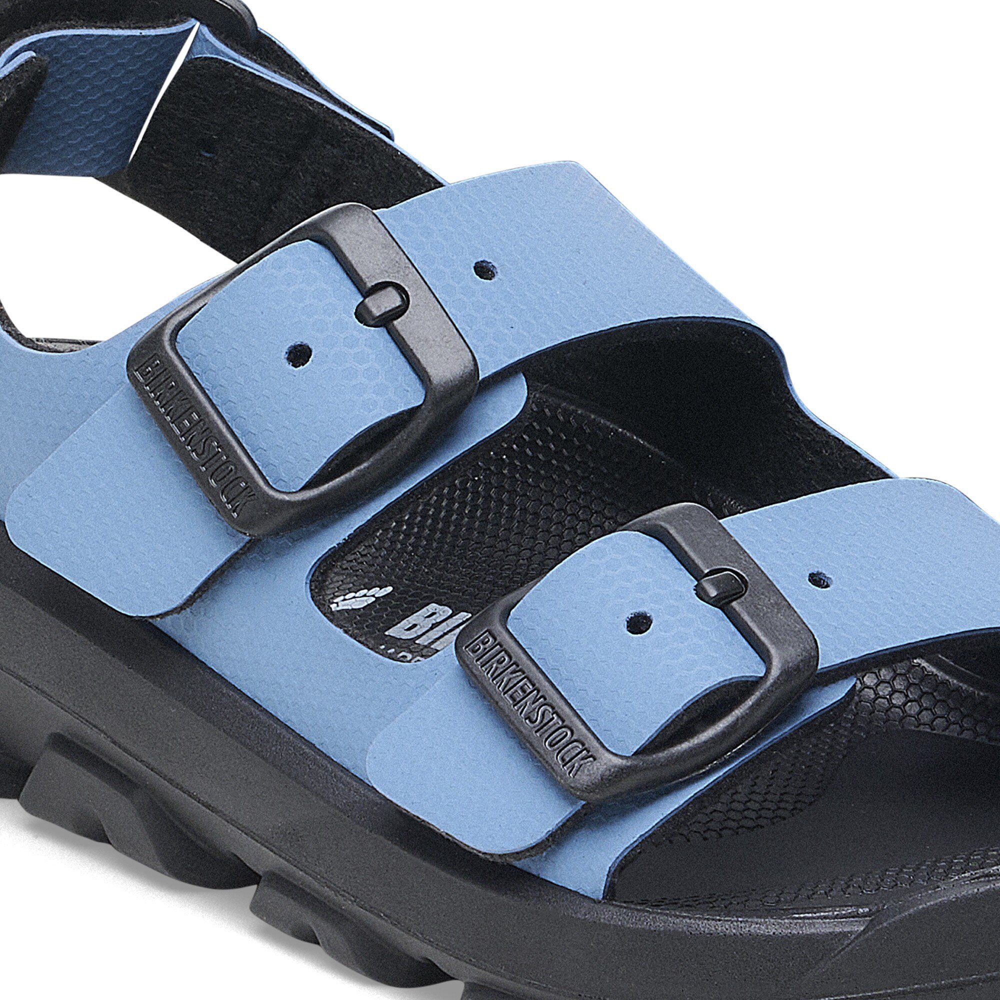 The perfect sandal for the playground, exploring forests, running across meadows, and jumping into puddles! The BIRKENSTOCK Mogami is the perfect match for adventures of any kind thanks to the waterproof footbed with toe protection and the highly functional sole which is injected into the footbed and upper in two layers. This makes the sandal extremely flexible and durable in any terrain. This version boasts vibrant colors. The upper is made from the skin-friendly, hard-wearing synthetic material Birko-Flor®.