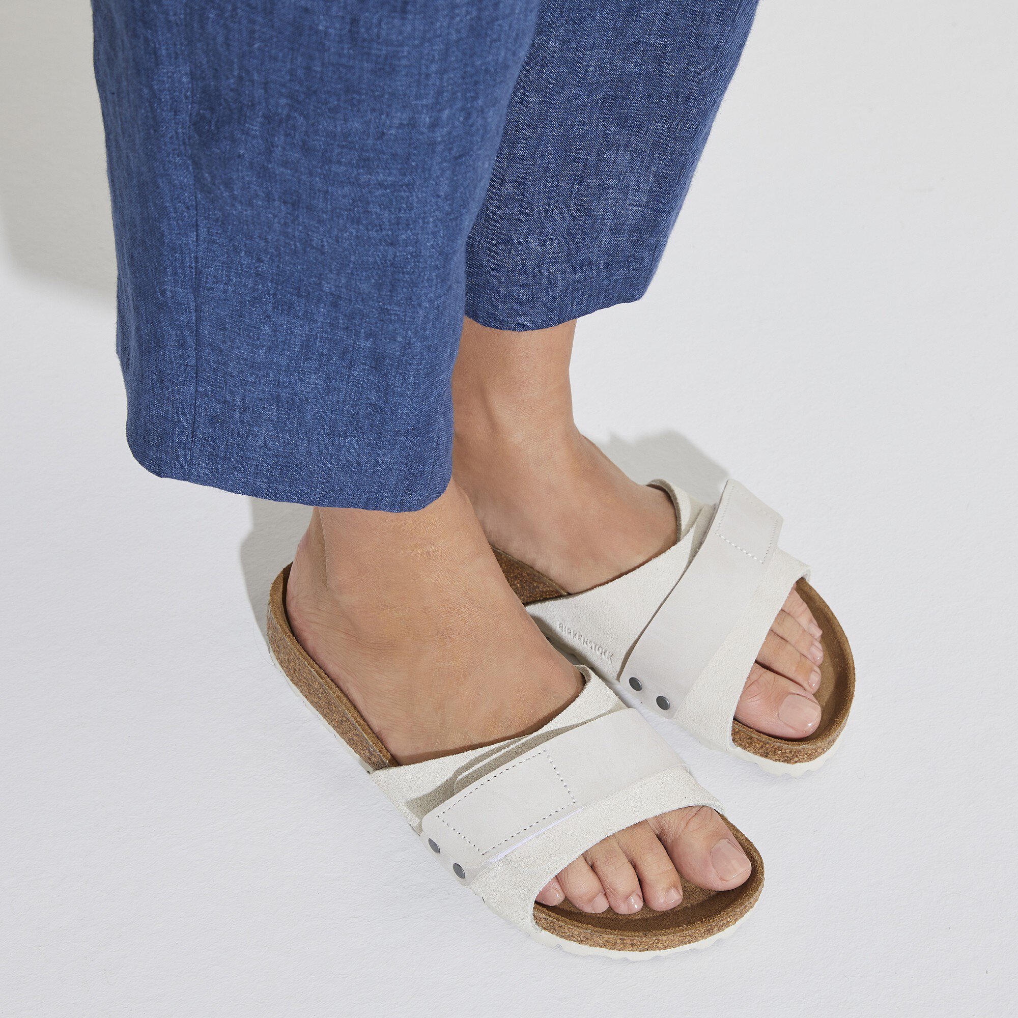The casual BIRKENSTOCK Oita takes its inspiration from the classic Kyoto model and stands out with its slim and feminine design and individually adjustable fastener. This offers optimum grip and is complemented by two decorative rivets. The upper is made from especially soft suede, which hugs the foot like a second skin, combined with high-quality nubuck leather.