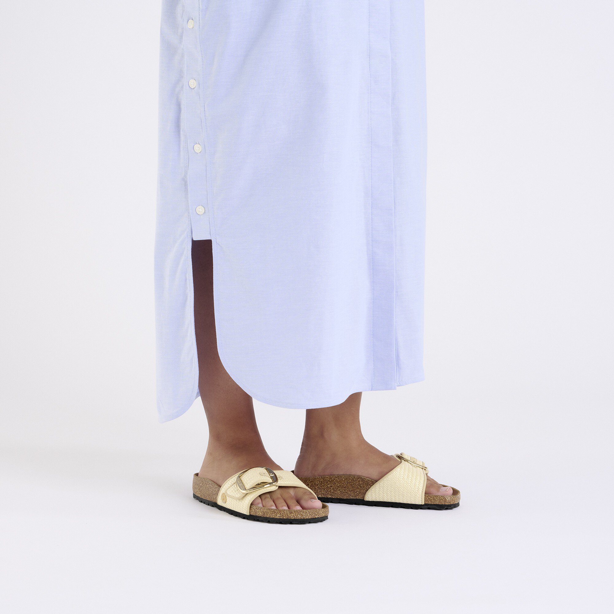 A BIRKENSTOCK Madrid a modellcsalád legrégebbi tagja, így egy igazi klasszikus. A fél évszázaddal ezelőtt „fitnesz-papucsként” bevezetett letisztult egypántos papucs már hosszú ideje divatos kísérőtárs. A raffia természetes textúrája teszi ezt a változatot különleges és figyelemfelkeltő nyári alapdarabbá, amely bármilyen alkalomra tökéletes. A felsőrész bőrbarát rugalmas szövetből készült.