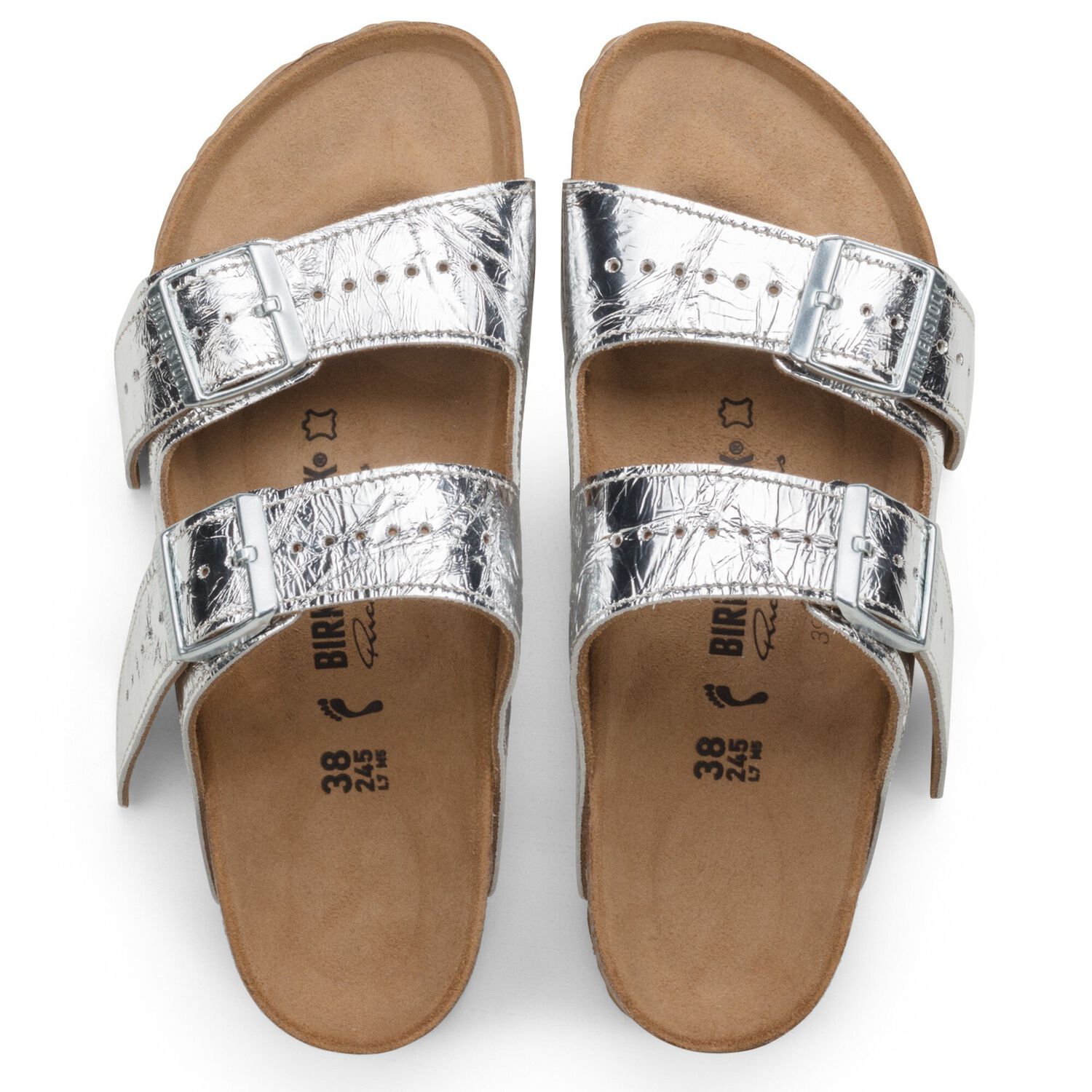 For his second collection, Rick Owens takes a look at the shape of things to come and adorns the trendy Arizona sandal with futuristic, shimmering colors. The enhanced cowhide is soft on the skin thanks to suede lining, while the brown sole is especially light, allowing you to step nimbly into the future.