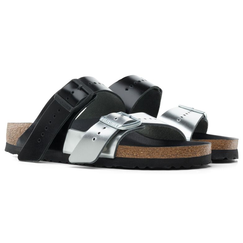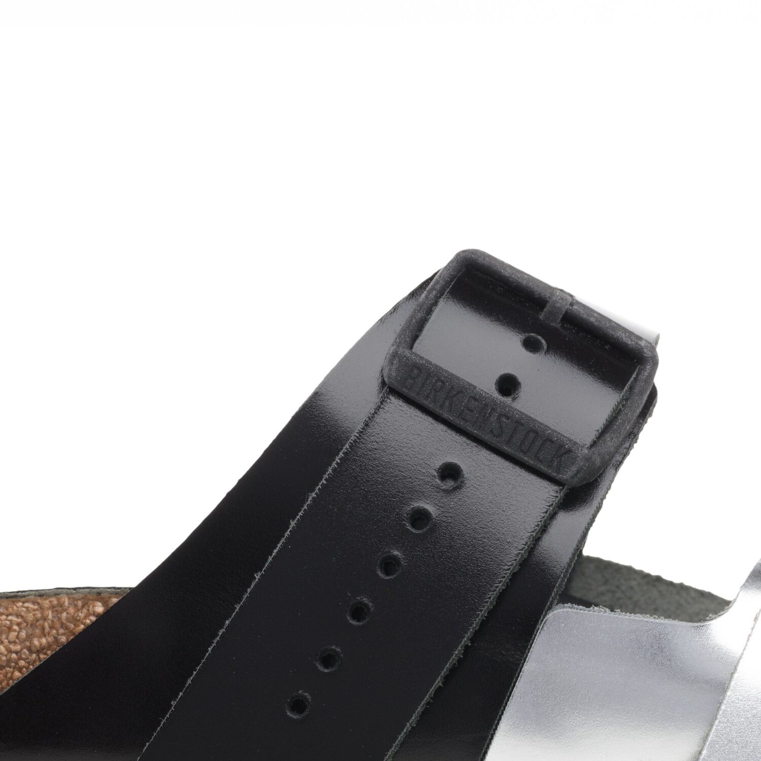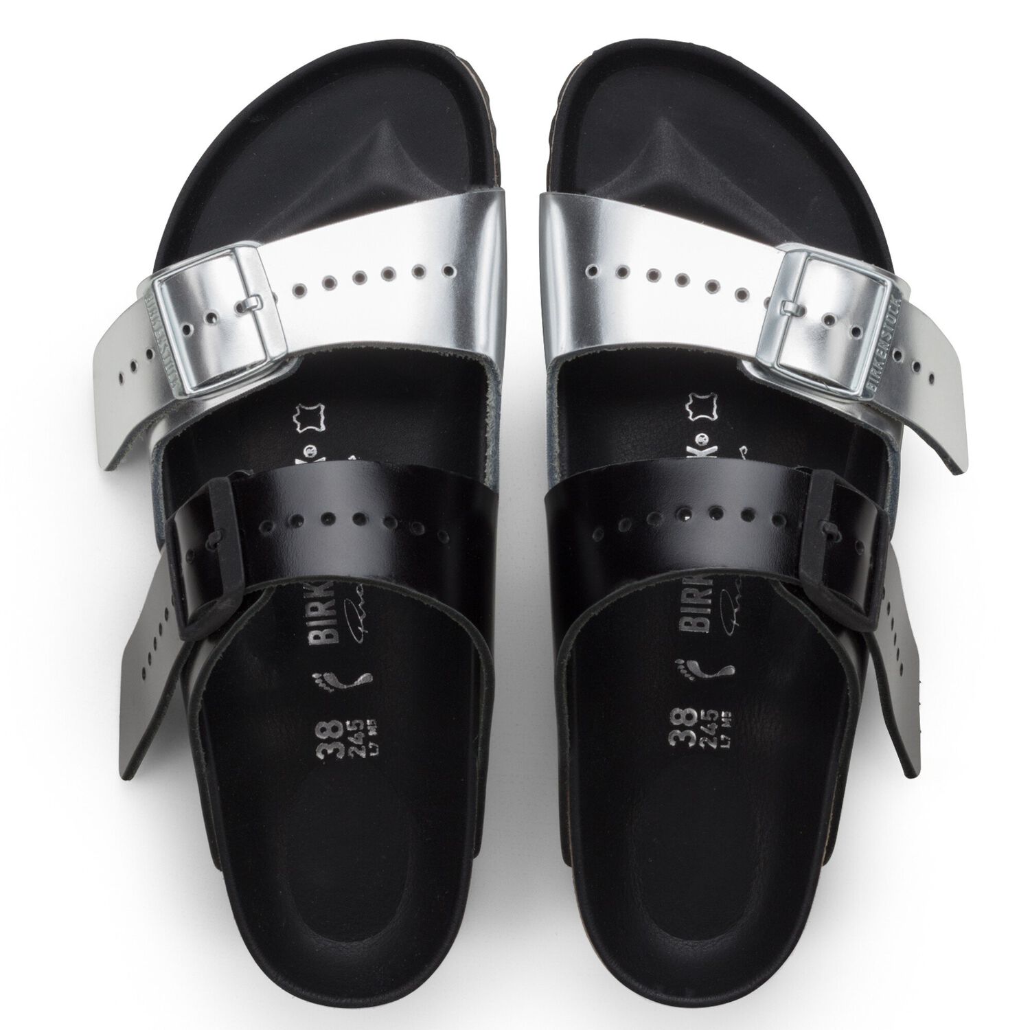 Two tones and duality in terms of material and finish – the trendy Arizona sandal plays with opposites and effuses casual elegance in the process. The extra long cowhide straps feature a surprising shimmering surface, while the footbed subtly yet confidently sports the Birkenstock × Rick Owens lettering.