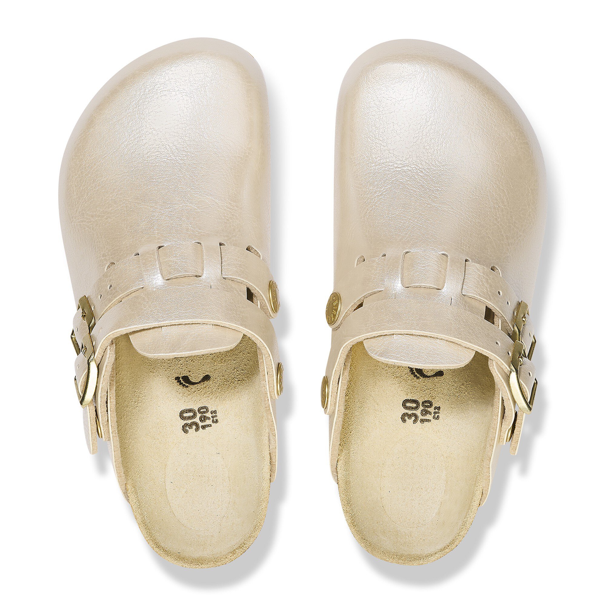 A comfy all-rounder! The BIRKENSTOCK Kay clog can be worn flexibly and offers additional grip at the heel if needed. Here, we see the sandal with a silky sheen finish. The color-coordinated footbed rounds off the shoe’s look of sophistication. The upper is made from the skin-friendly, hard-wearing synthetic material Birko-Flor®. The Kay clog is therefore a suitable model for active kids – there’s little chance of shoes getting lost.