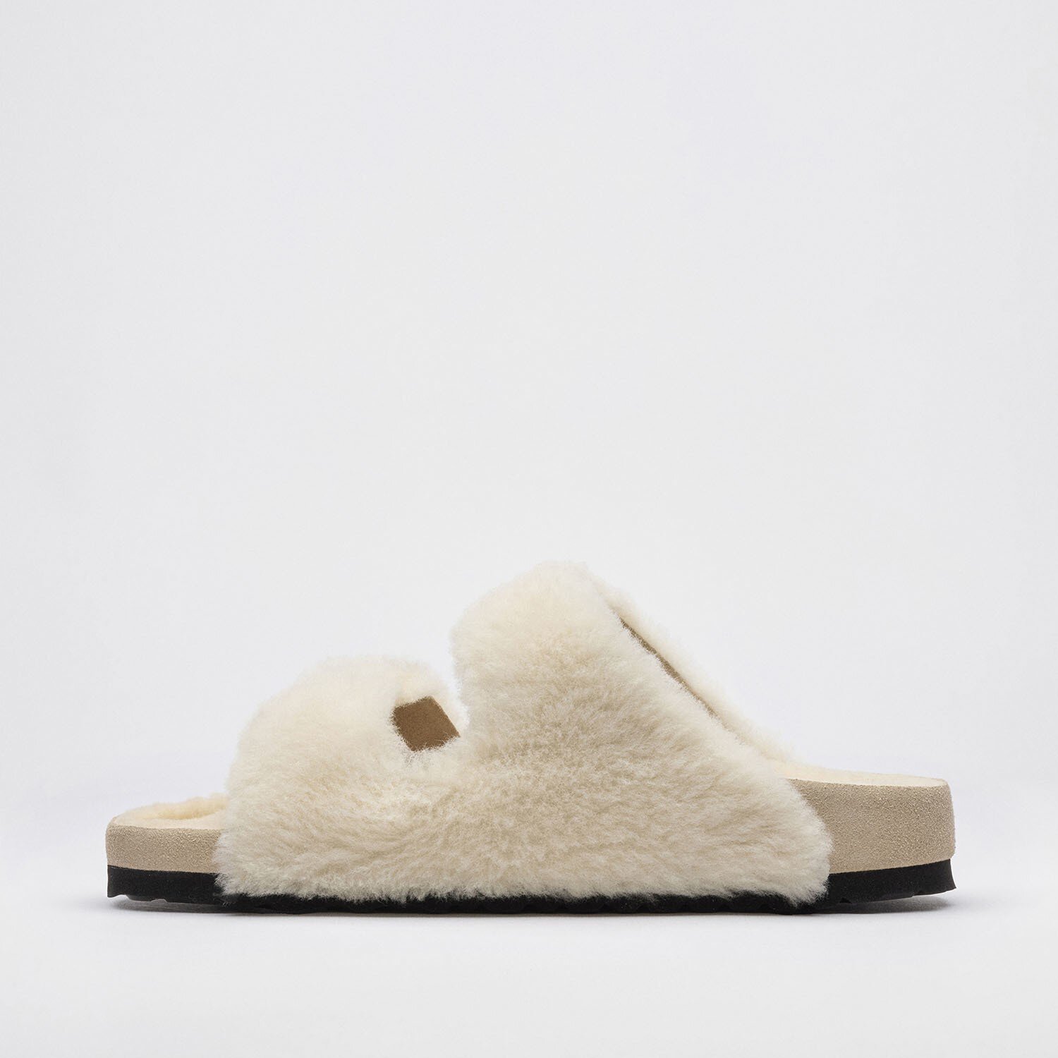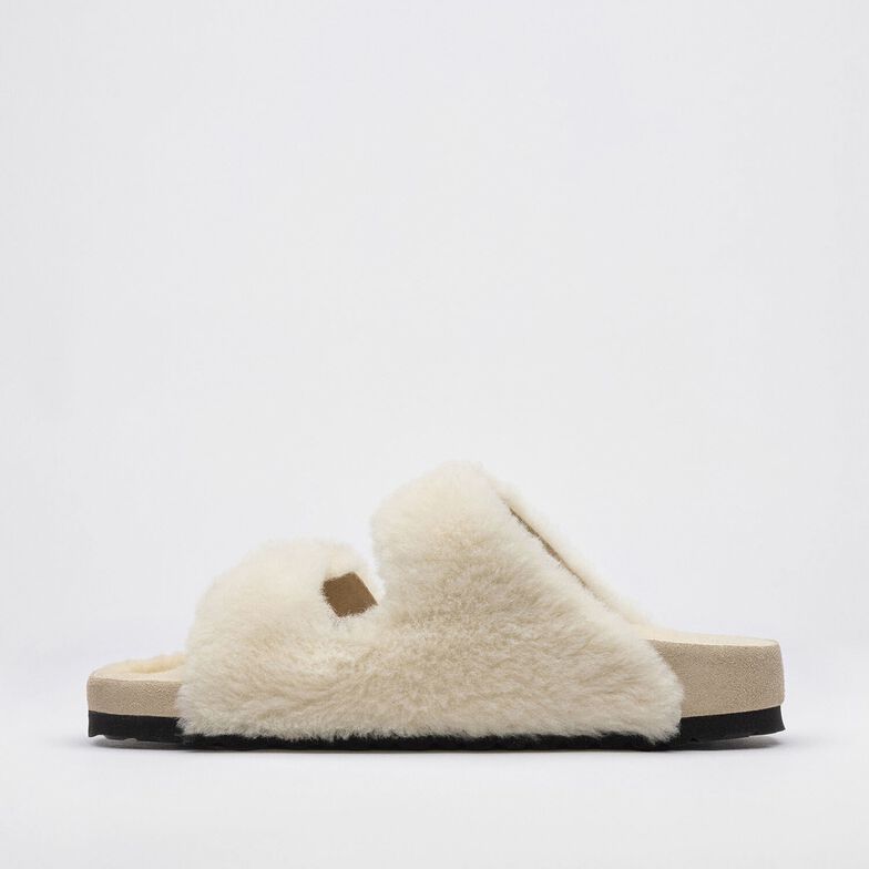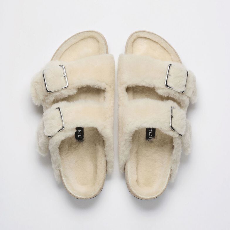 そのシルエットをアピールするかのごとく、Arizonaが中から外までシアリングで覆われ、大胆にグレードアップしました。キャラメルとクリームのアッパーにはエクスクルーシブ感たっぷりのシルバーの1774バックルが添えられています。BIRKENSTOCKのシグネチャーフットベッドには同素材のシアリングライニングが施されています。フットベッドの縁をアッパーに合わせたスエードで覆い、このバージョンでは贅沢な質感と時代を超えたデザインが美しく融合しています。