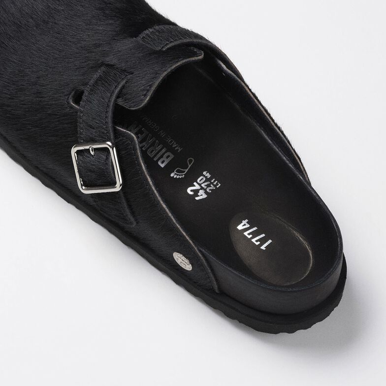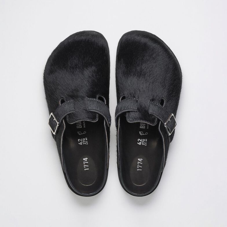 クラシックなシルエットを強調するかのように高級感あふれるポニーライクファーのアッパーを纏い、定番Bostonクロッグが新デザインで登場します。ヒョウ柄とブラックのアッパーにはエクスクルーシブ感たっぷりに1774バックルが添えられています。BIRKENSTOCKのシグネチャーフットベッドをベースに、上質な同系色ナッパレザーで覆われたこのクロッグは、1920年代ベルリンのエレガンスと当時の人々の豊かな芸術家精神を表現しています。