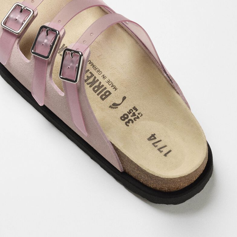 アッパー:マット仕上げの半透明カラーPVC、コンフォートを追求し面取りされたエッジ、バックル部分には高級カザドールレザーを使用。