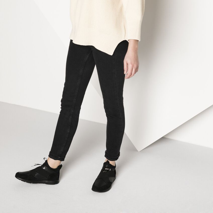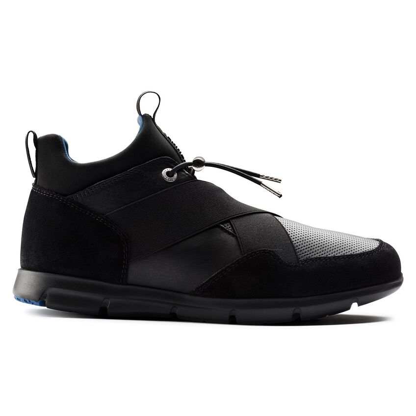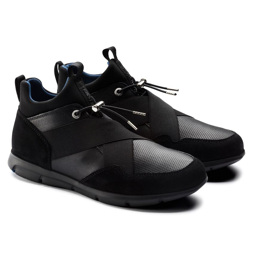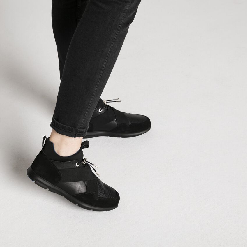 近未来的なデザインに機能性が融合されたビルケンシュトックのAmes。ウェットスーツなどにも使用されているネオプレン素材を使い、ソックスをイメージしてデザインされています。アッパーは足にぴったりと馴染み、伸縮性のあるシューレースでホールド感を調整することができます。さらにクロスされたバンドがフィット感を生み、足元をすっきり見せてくれます。上質なスムースレザーとソフトなスウェードの組み合わせがスタイリッシュなスニーカーです。