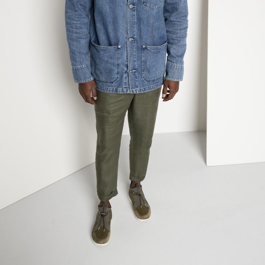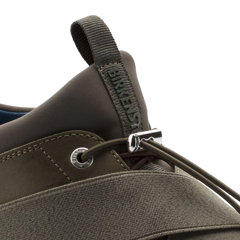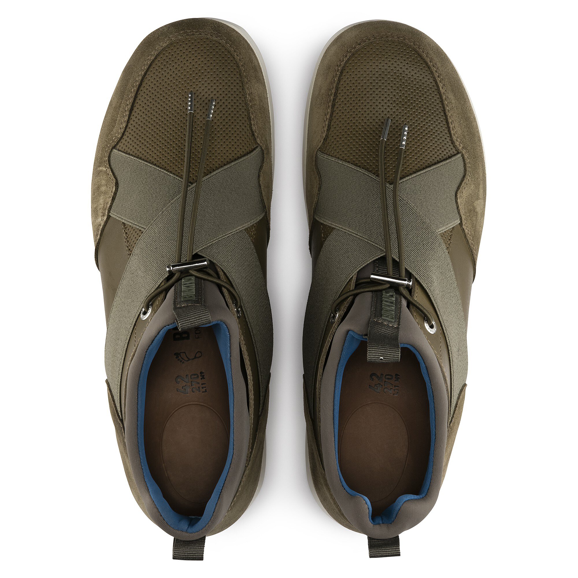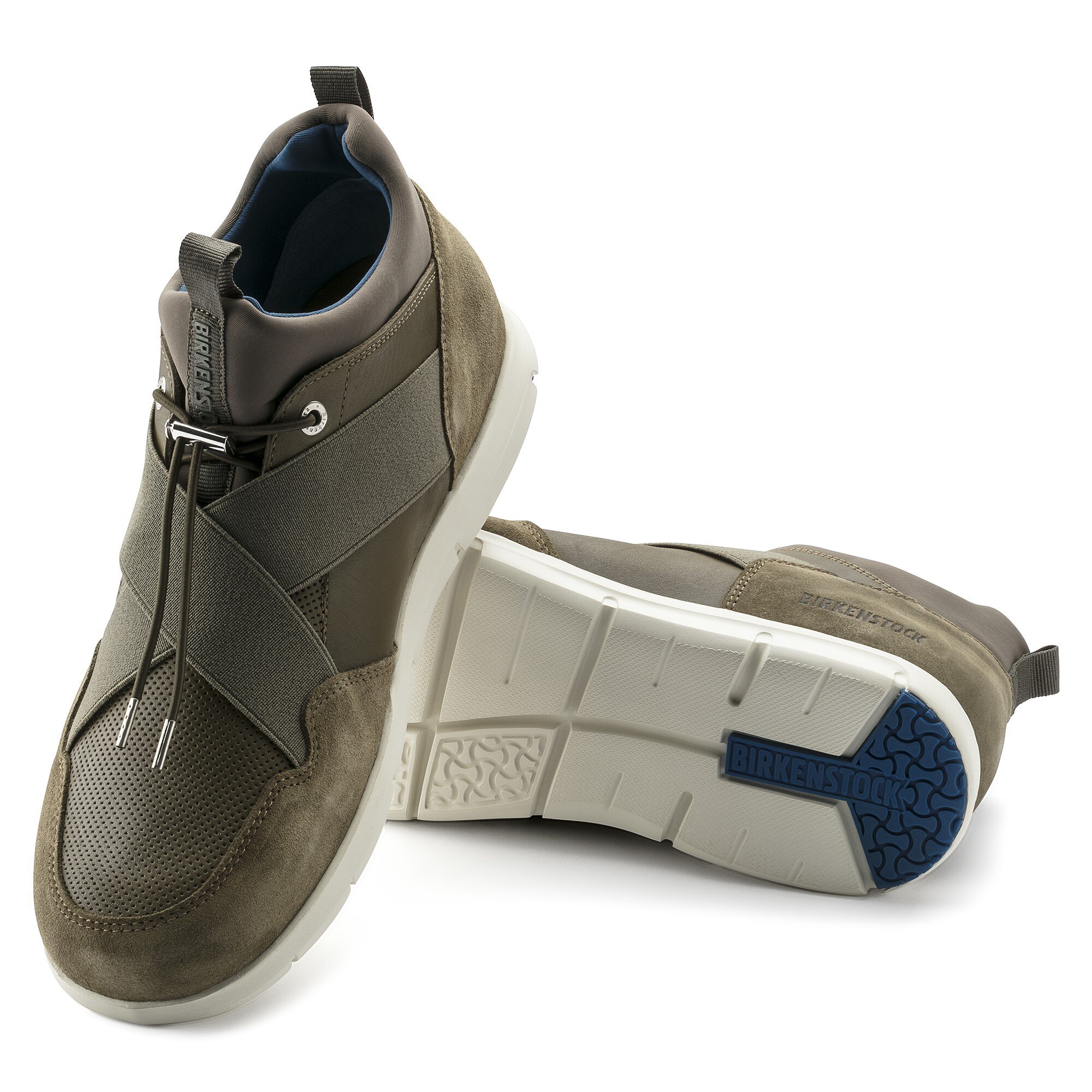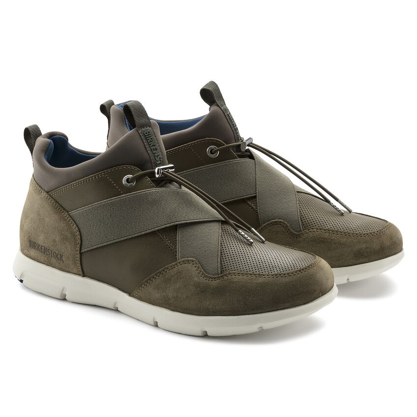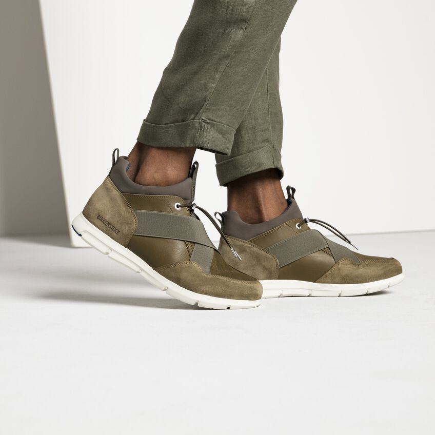 近未来的なデザインに機能性が融合されたビルケンシュトックのAmes。ウェットスーツなどにも使用されているネオプレン素材を使い、ソックスをイメージしてデザインされています。アッパーは足にぴったりと馴染み、伸縮性のあるシューレースでホールド感を調整することができます。さらにクロスされたバンドがフィット感を生み、足元をすっきり見せてくれます。上質なスムースレザーとソフトなスウェードの組み合わせがスタイリッシュなスニーカーです。