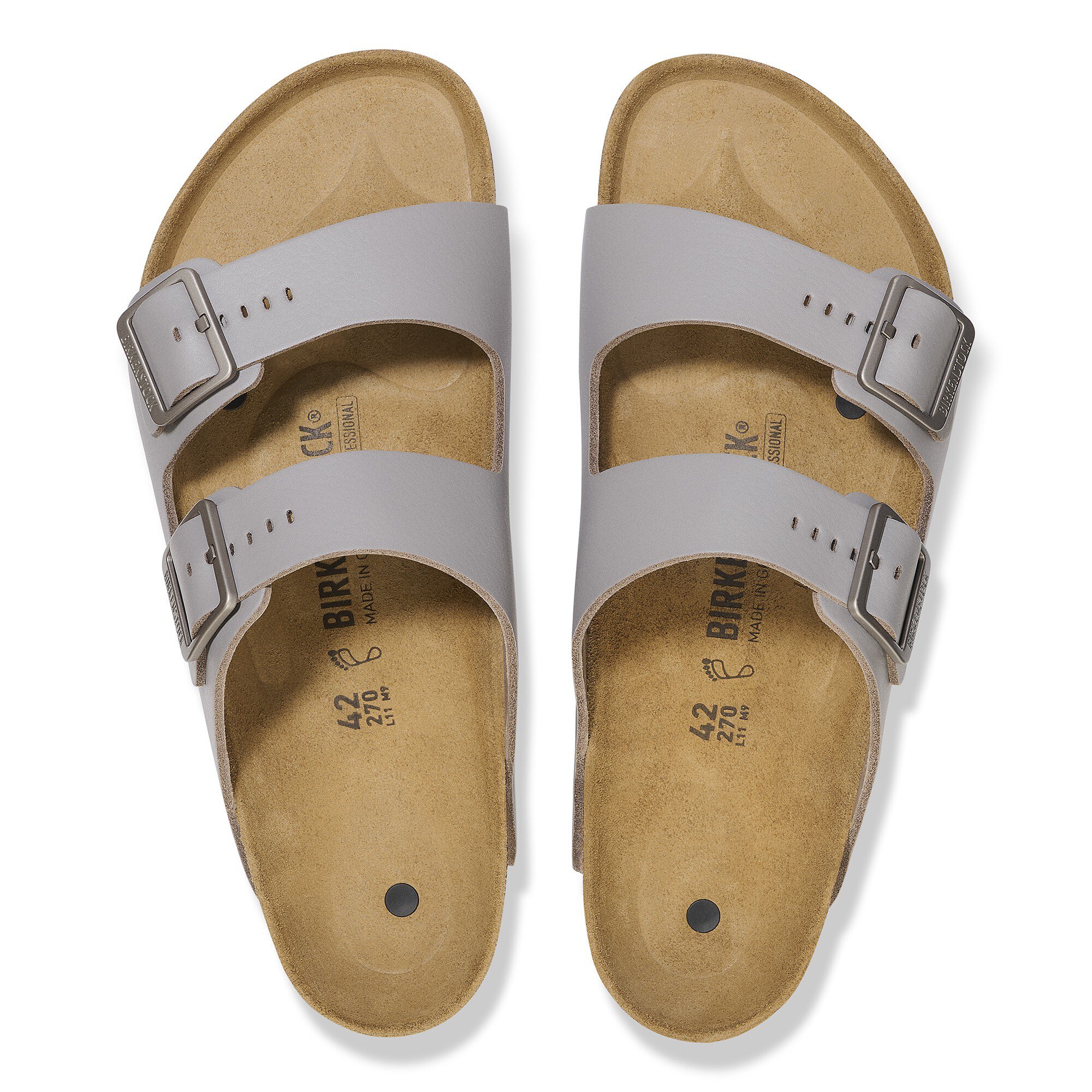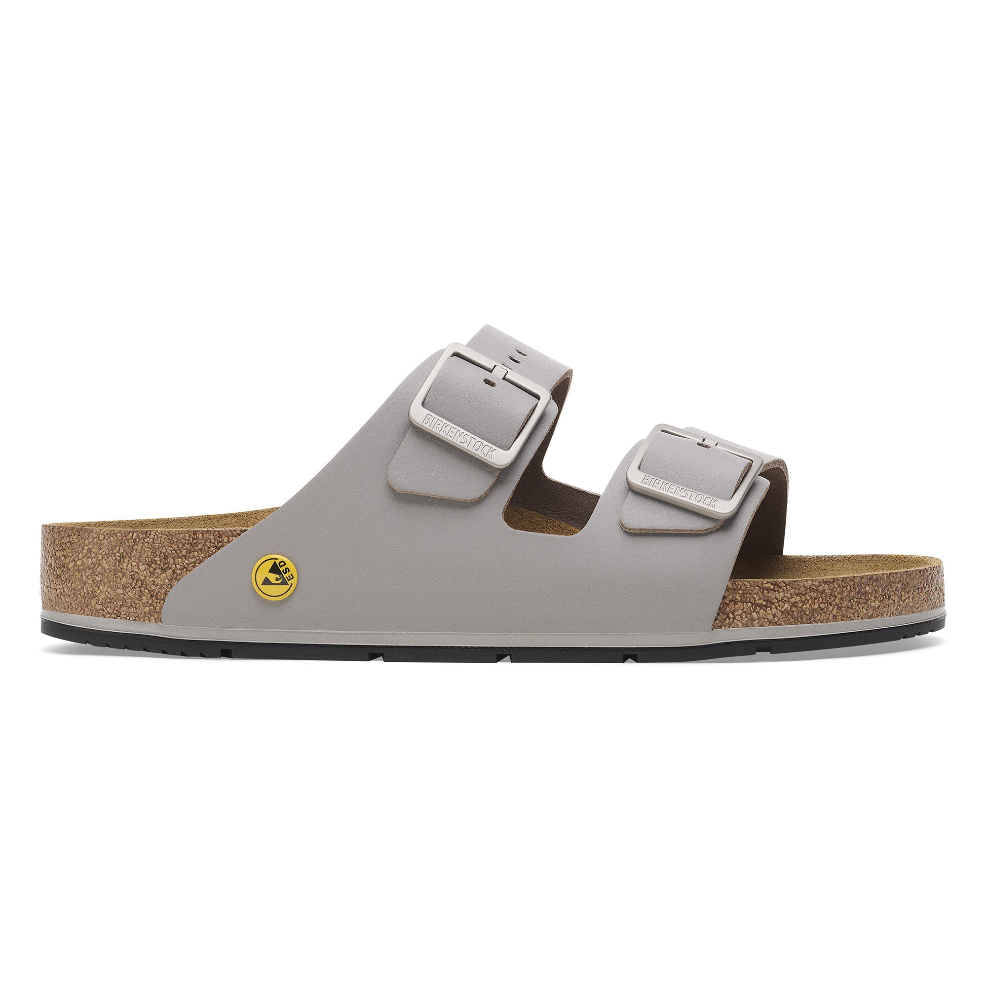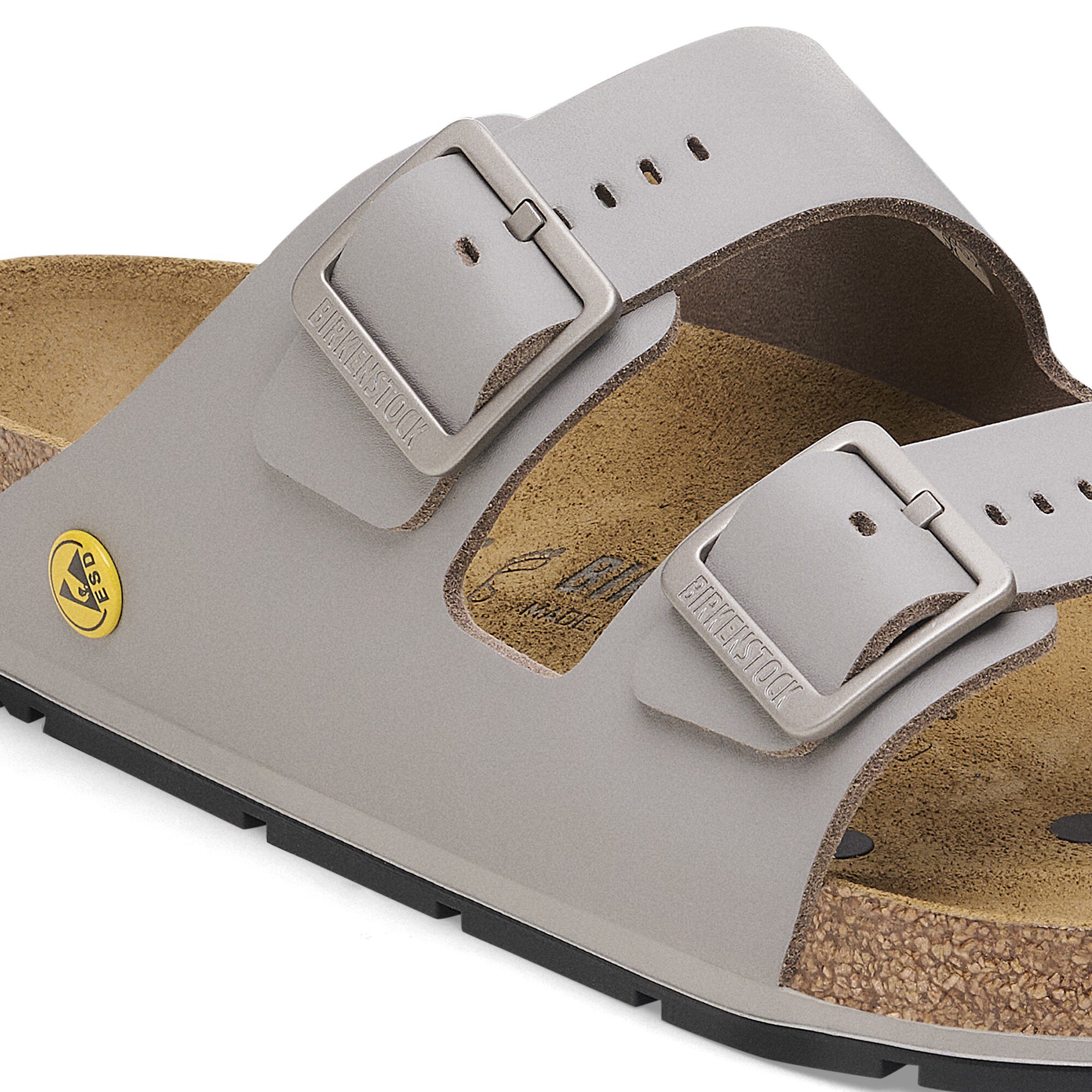 BIRKENSTOCKのダブルストラップサンダルArizonaを履けば、足の形状を考慮した天然ゴム混合コルクフットベッドの極上のコンフォートを仕事場でもたっぷり味わうことができます。このモデルは静電気を避けなければならない職場での使用に適した、静電気放電防止特性を備えたESDモデルです。特別に開発されたアウトソールとフットベッドの組み合わせにより、一定した微量の静電気放電が保証され、繊細な部品をしっかりと保護します。アッパー素材にはポリウレタン(PU)コーティングを施した上質なソフトナチュラルレザーを使用しています。PUコーティングを施すことで、素材の耐久性を向上し、長い間ご愛用頂ける丈夫なモデルに仕上がっています。BIRKENSTOCKのESDモデルはすべて、DIN EN 61340の基準に基づいた試験を通過し、ESD要件1.0 x 105~3.5 x 107Ωを満たしています。
