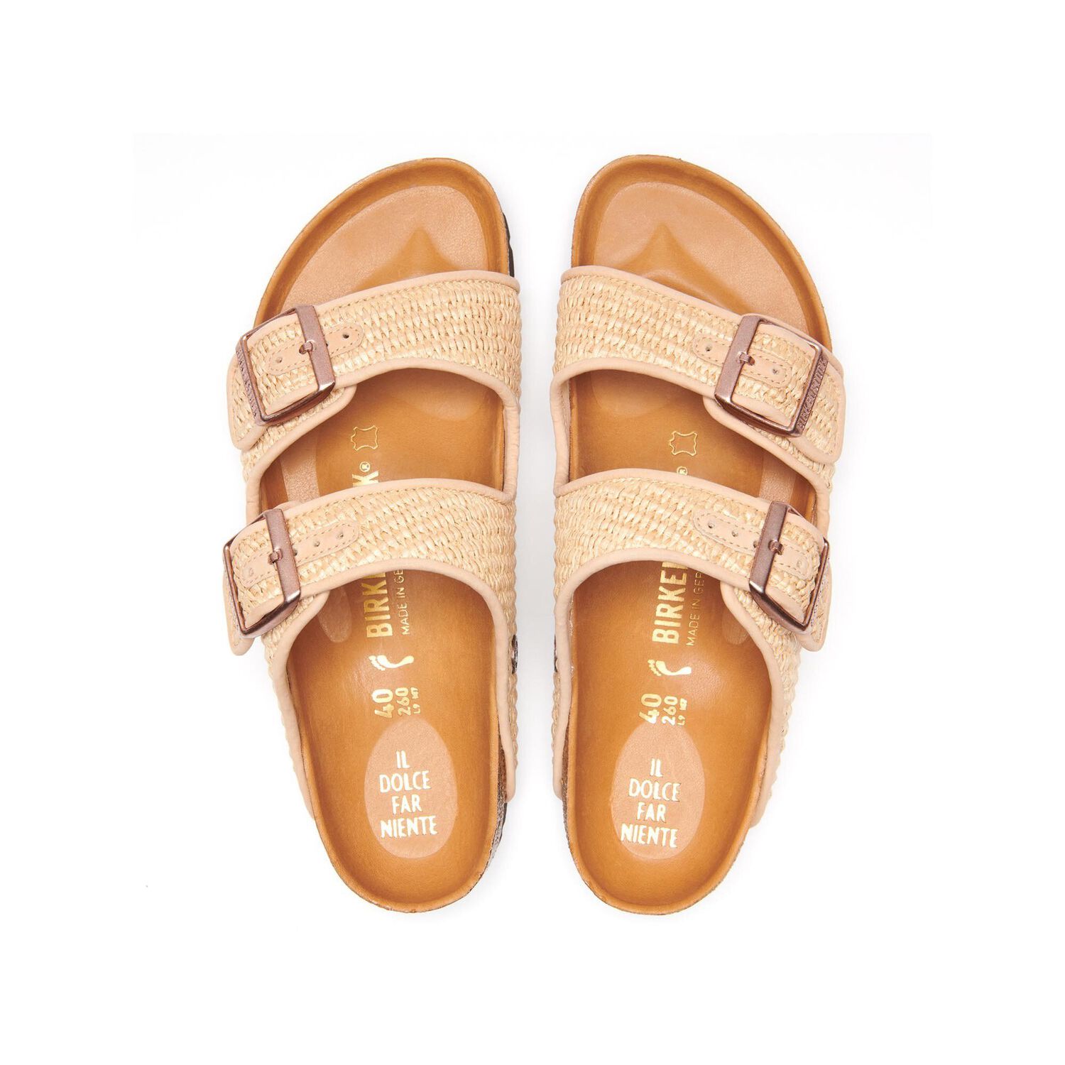 ドイツの伝統とイタリアのクラフトマンシップの融合:ビルケンシュトックはこのサンドカラーのArizona/アリゾナで初めて、このシューズに贅沢なタッチを添える合成靱皮、ラフィアを採用ました。エレガントなサンドカラーで仕上げられたこのサンダル、日焼けした足を美しく演出するだけではなく、まるで裸足で砂浜を歩いているような優しい肌触りをお楽しみいただけます。足の形状を考慮した天然ゴム混合コルクフットベッドとEVA製アウターソールが軽やかなステップを約束します。