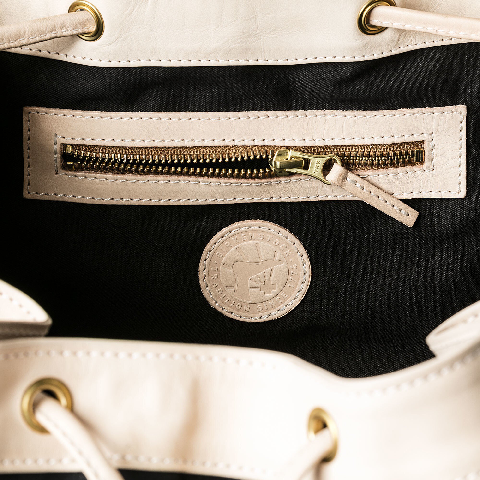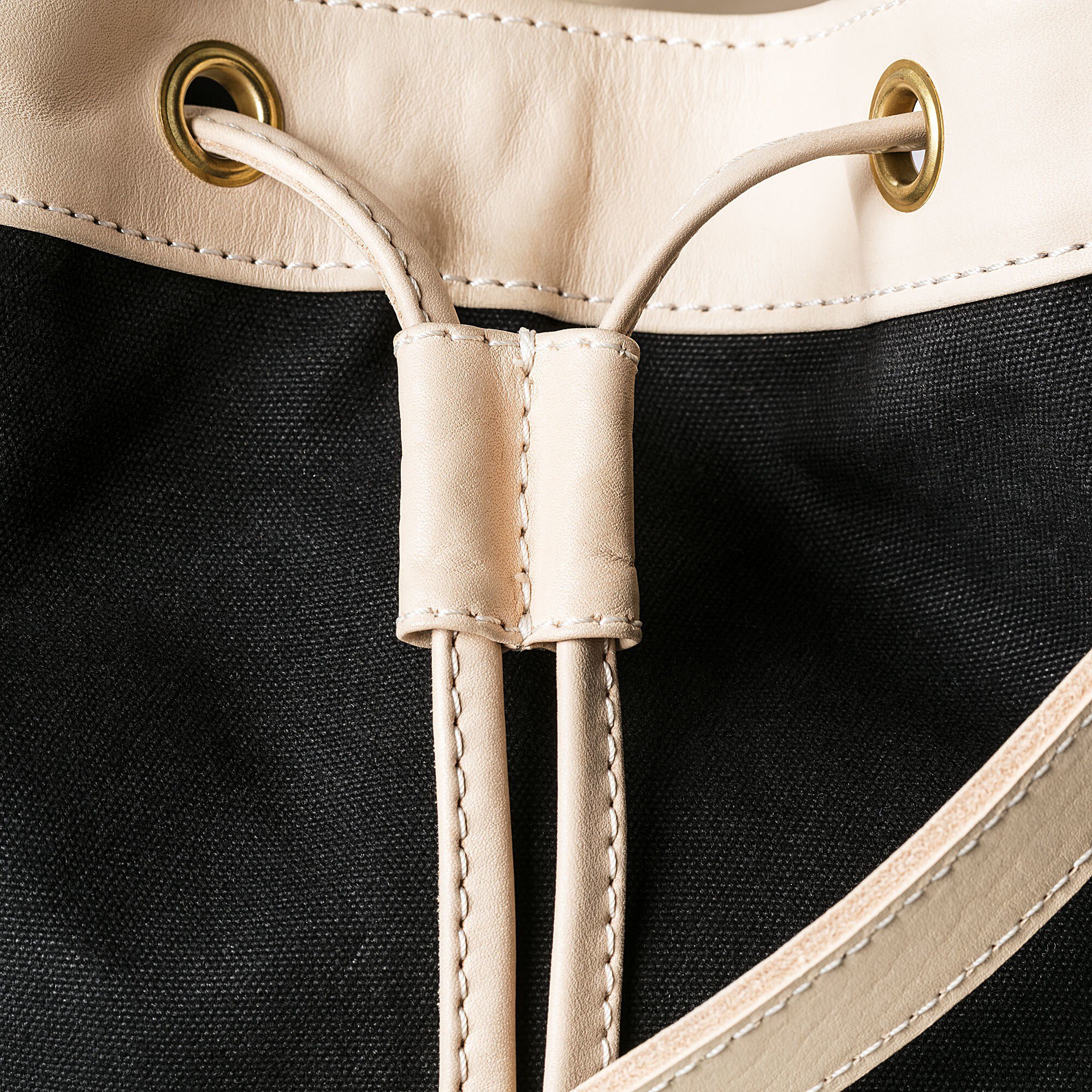 - 植物性タンニンなめしのナチュラルレザー製の紐でバッグをしっかりクローズ