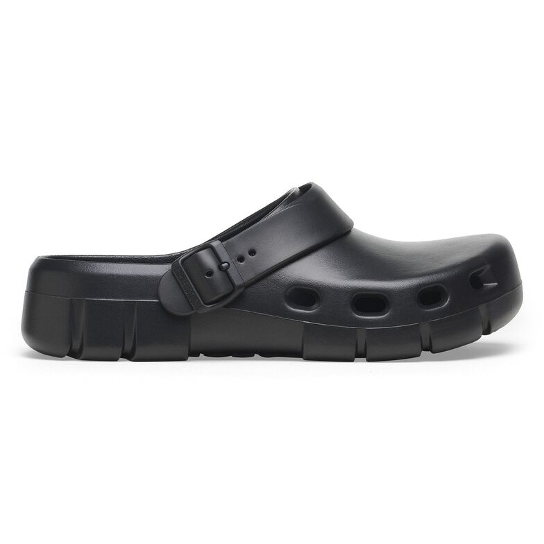 BIRKENSTOCKのBirki Flowは季節を問わず一年中便利な真の定番です。大きな通気孔が空いているこのクロッグなら、いつも新鮮な空気が循環し、足がムレる心配もありません。コルク製サンダルの形状を模しながら、このサンダルには柔軟性に優れた超軽量素材EVAを使用しています。有害物質検査済みのEVAは無臭など様々な特性が自慢の素材です。お洒落で軽やか、弾性にも富んだこのモデルは、ショックをしっかりと吸収し、防水性にも優れ、お肌にも優しい一足です。