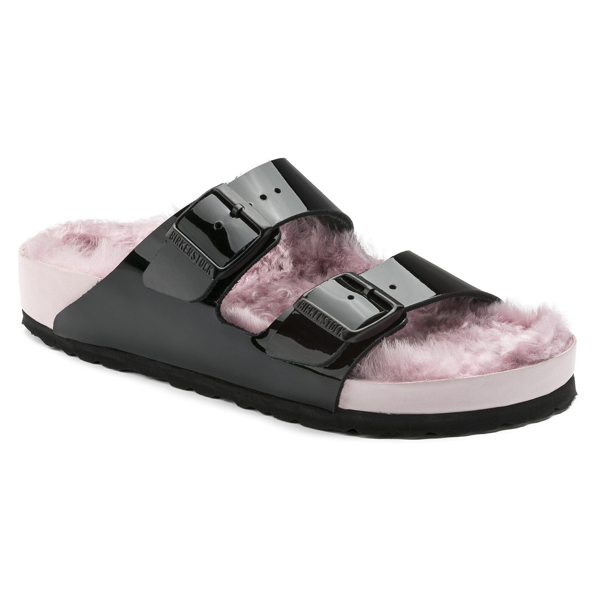 共同制作による限定デザインは実用的でありながら遊び心のある革新的なデザインです。ひとつは、ビルケンシュトックの定番であるアリゾナにカラフルなファーライニングを組み合わせたもので、ブラックのパテントレザーとピンクのファーライニング、ピンクレザートリムによるコントラストが印象的です。もうひとつはアリゾナをベースに、ダークグレーのベロアレザーにオーバーサイズのメタリック バックルとブルーのファーライニング、グレーレザートリムを組み合わせたモデルです。