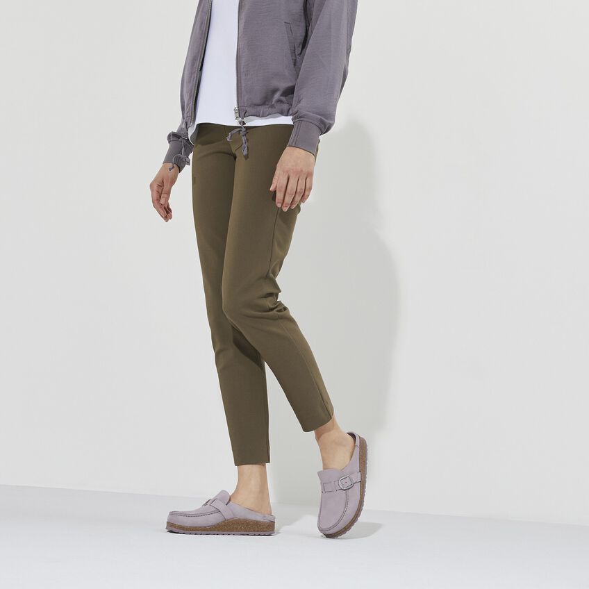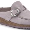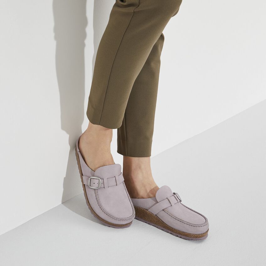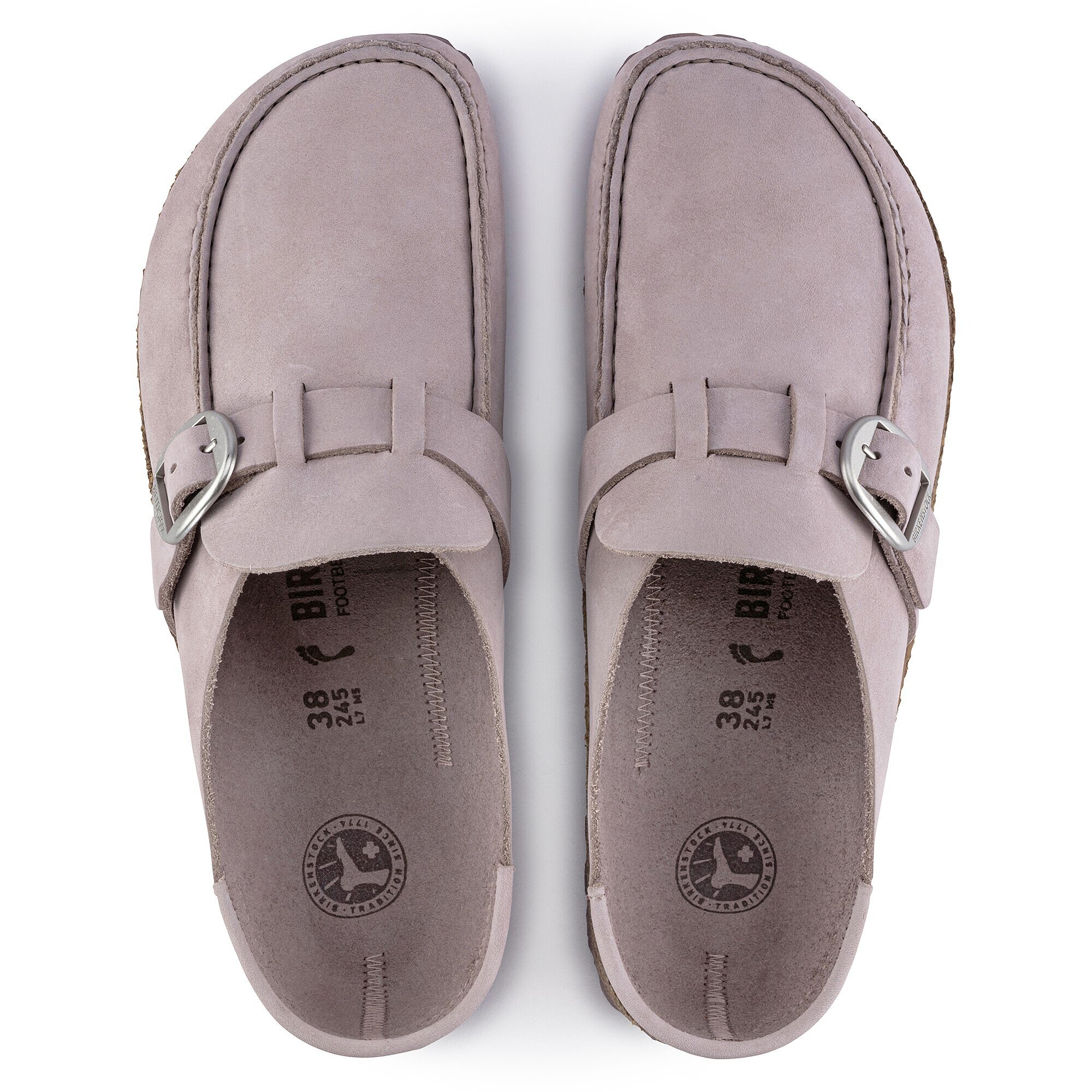 たっぷりワイドなコルク製ソールを見れば一目でBIRKENSTOCKブランドだとわかるこのBuckley、モカシン風のハーフクロッグです。一味違うステッチがこの一足にちょっと人目を惹くアクセントを添えています。カラーコーディネートされたフットベッドでアピアランスもきれいにまとまっています。アッパーにはナチュラルなアピアランスが素敵なハイグレードヌバックレザーを使用しています。