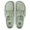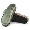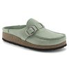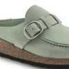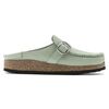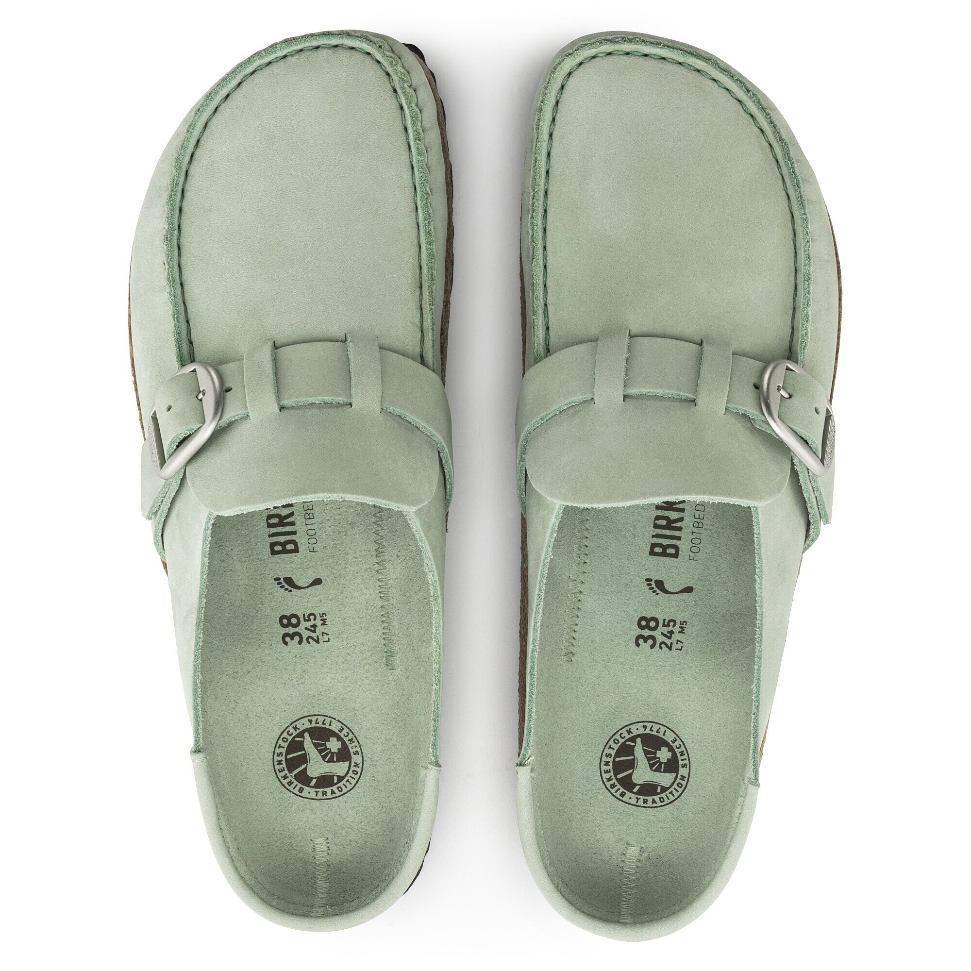 たっぷりワイドなコルク製ソールを見れば一目でBIRKENSTOCKブランドだとわかるこのBuckley、モカシン風のハーフクロッグです。一味違うステッチがこの一足にちょっと人目を惹くアクセントを添えています。カラーコーディネートされたフットベッドでアピアランスもきれいにまとまっています。アッパーにはナチュラルなアピアランスが素敵なハイグレードヌバックレザーを使用しています。