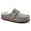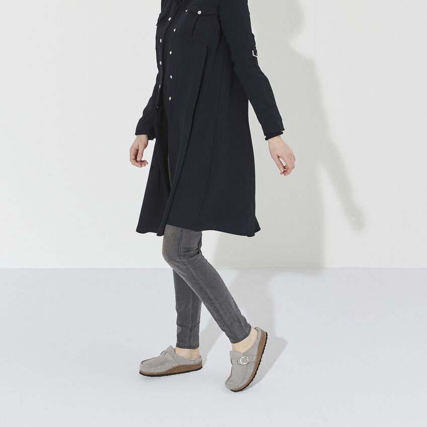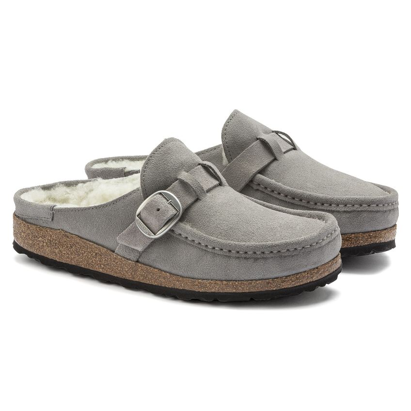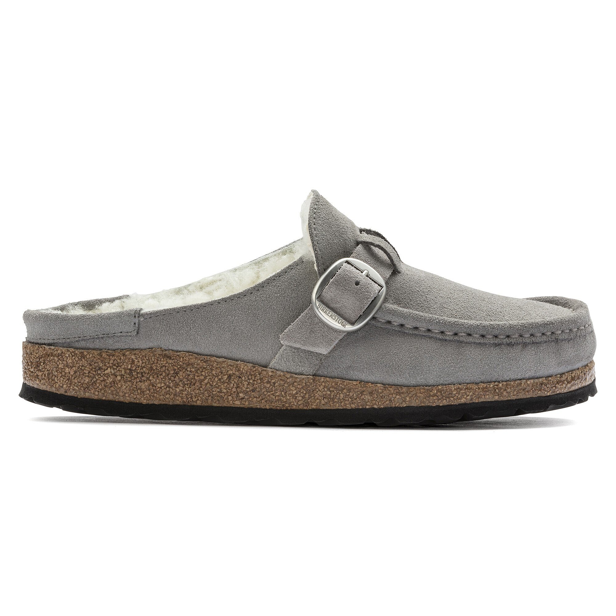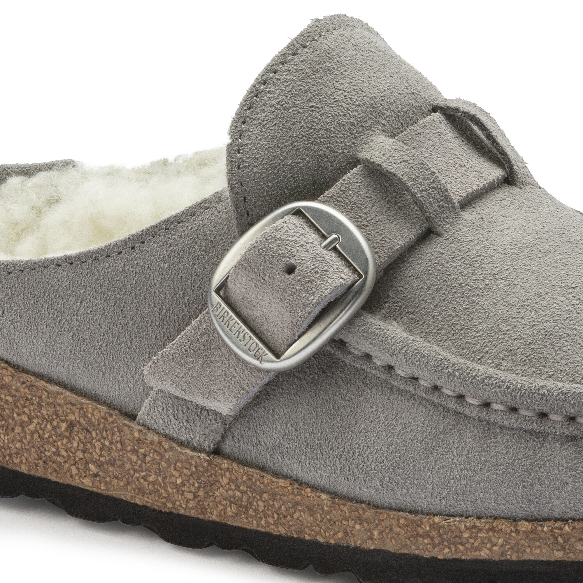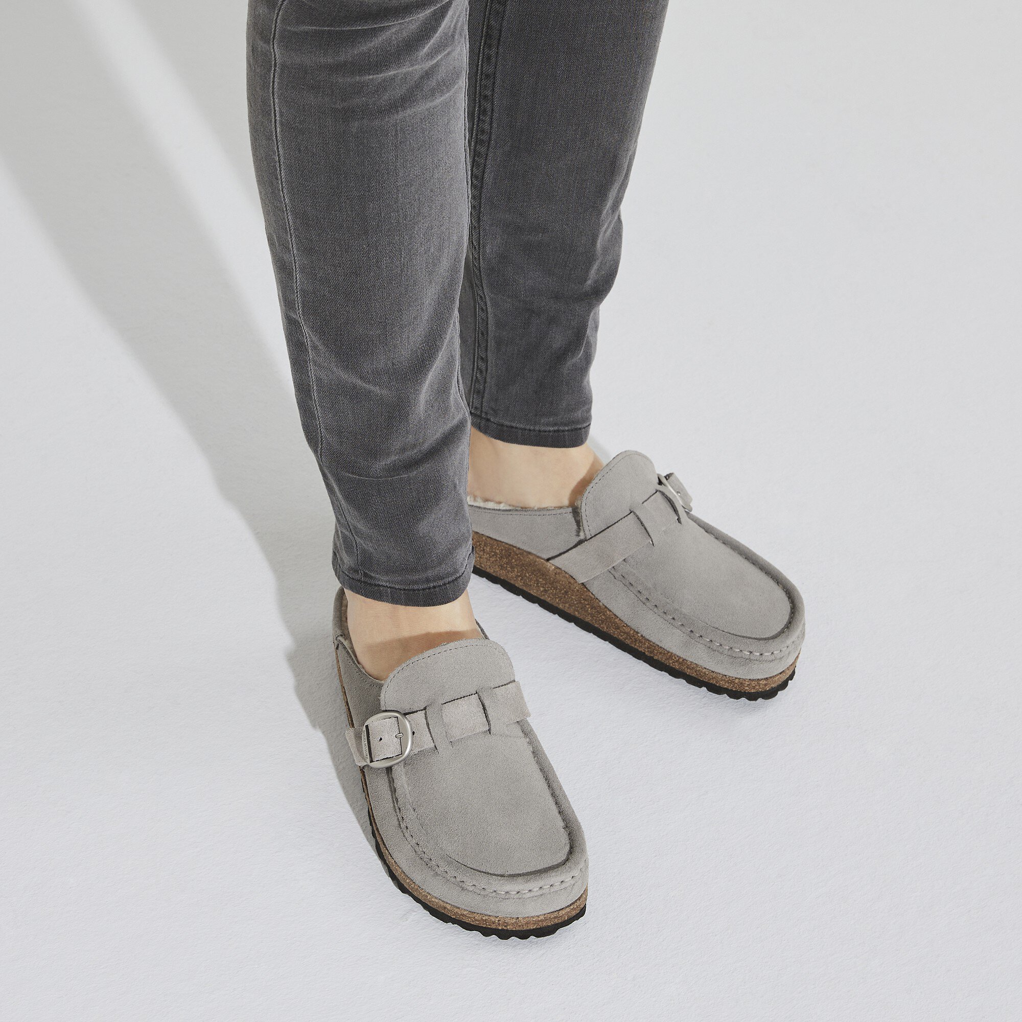 たっぷりワイドなコルク製ソールを見れば一目でBIRKENSTOCKだとわかるこのBuckley、モカシン風のハーフクロッグです。一味違うステッチがこの一足にちょっと人目を惹くアクセントを添えています。この定番が今回、ラウンドシェイプのシャイニーバックルとラムスキンボアを使ったホカホカモデルで登場します。アッパーには足を優しく包み込むソフトスエードレザーを使用しています。ナチュラル感たっぷりのデザインをお楽しみください。